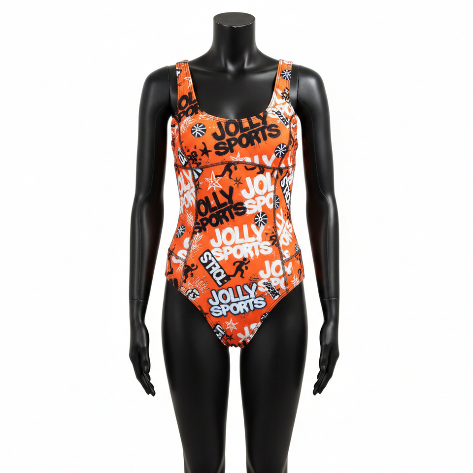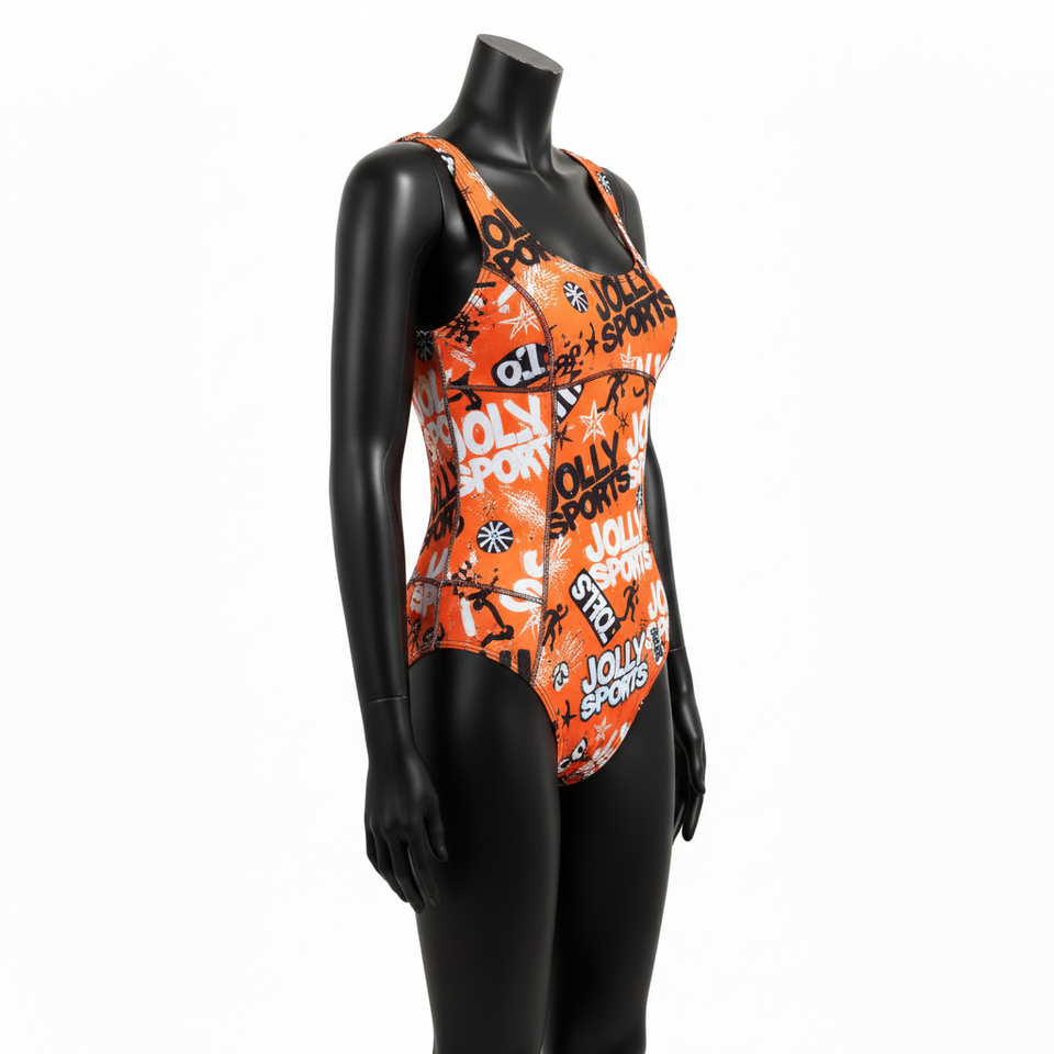 Tissu extensible en polyester et élasthanne de qualité supérieure, imprimé intégral orange vif, avec logo personnalisé par sublimation, pour maillot de bain femme.
