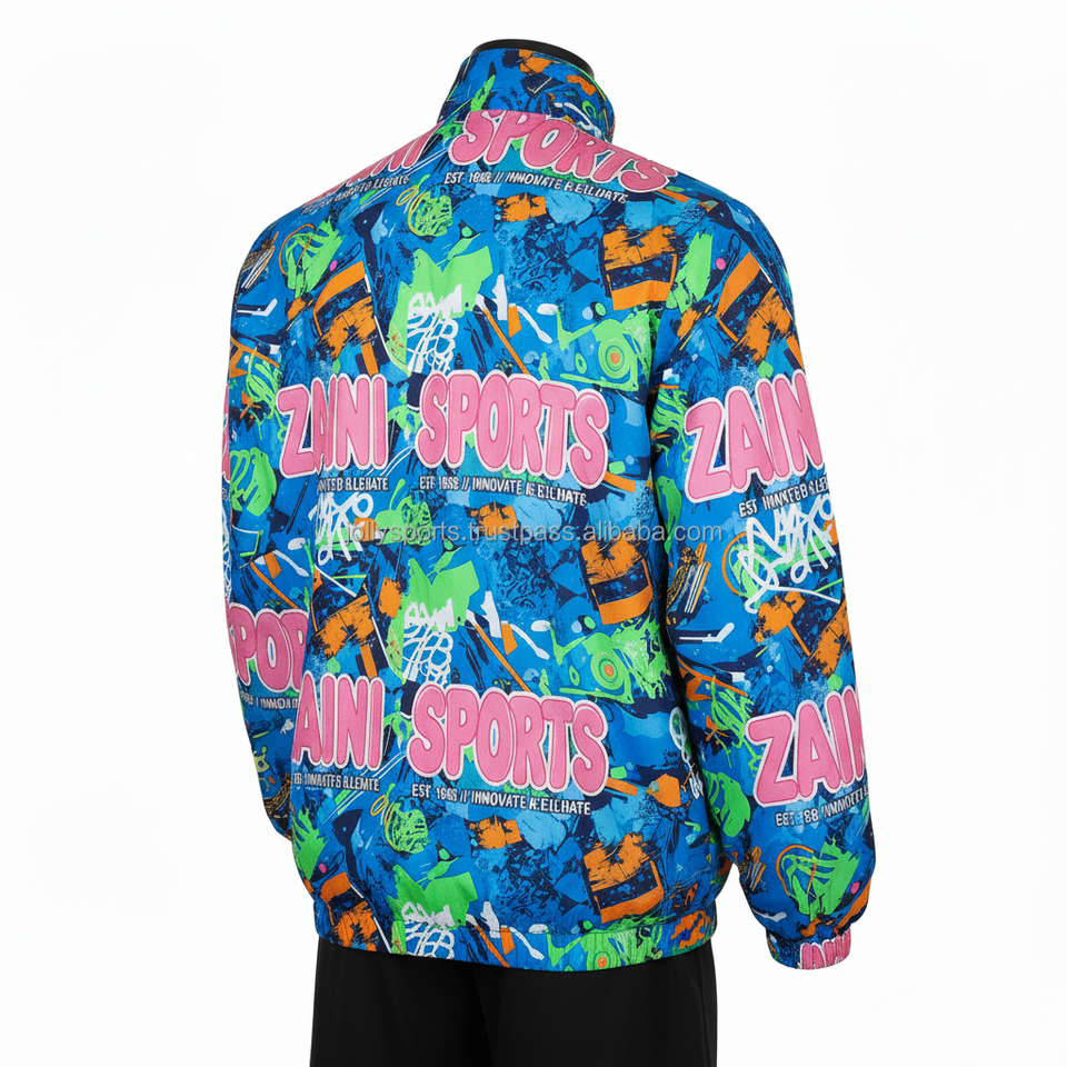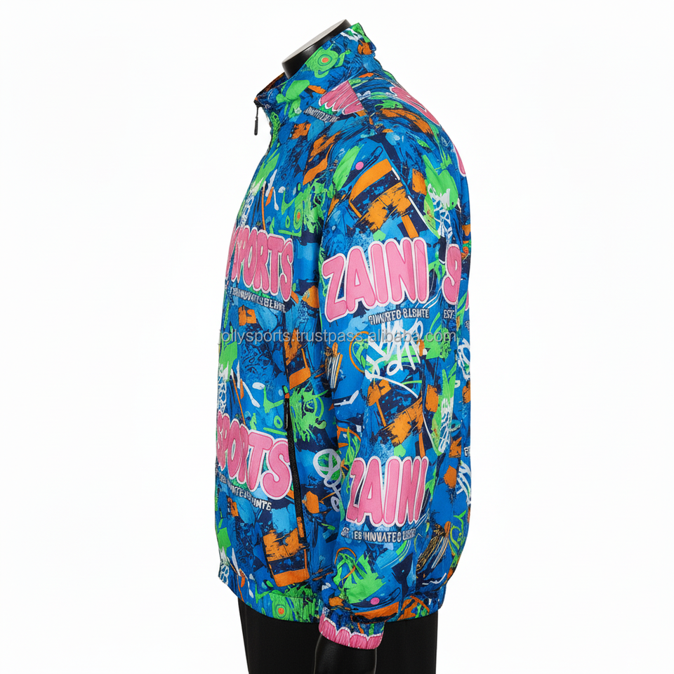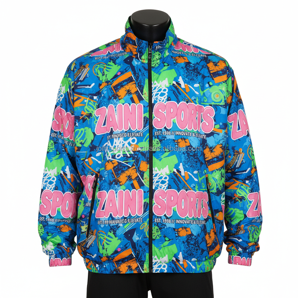 Veste coupe-vent en polyester de qualité supérieure 150 GSM Impression par sublimation multicolore vibrante avec logo personnalisé Veste coupe-vent pour homme