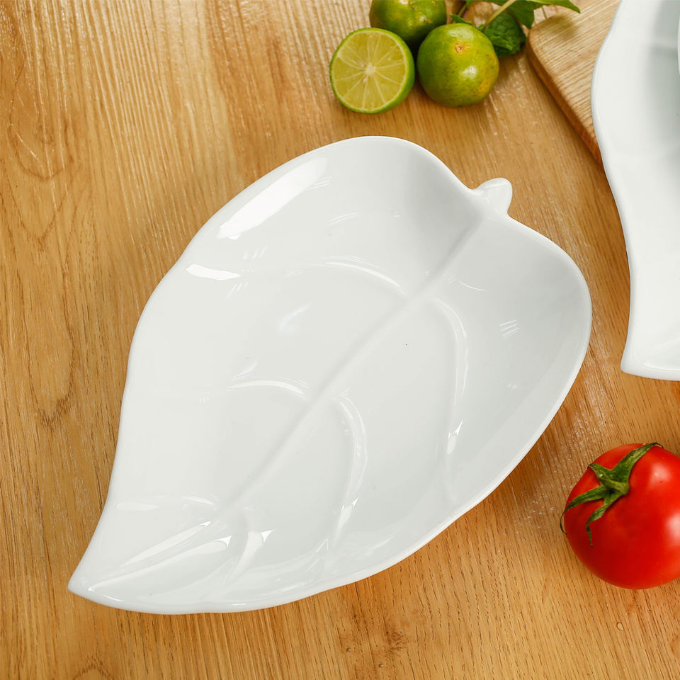 Assiette à dessert en forme de feuille de taille personnalisable en porcelaine de qualité supérieure pour l'hospitalité gastronomique
