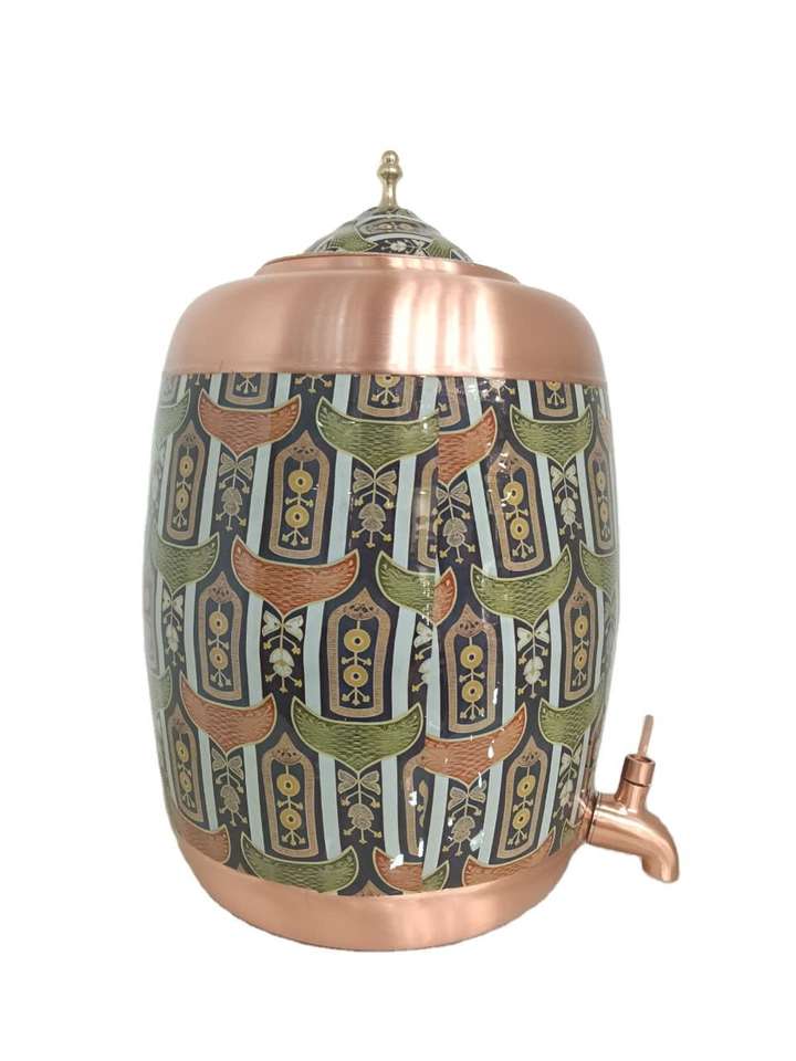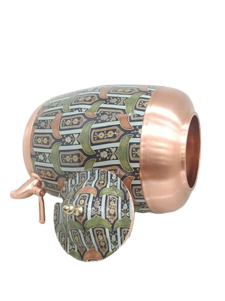 Distributeur d'eau en cuivre pur imprimé de qualité supérieure de 8 litres / Matka avec robinet anti-fuite, design classique pour la maison et le bureau, bienfaits ayurvédiques pour la santé