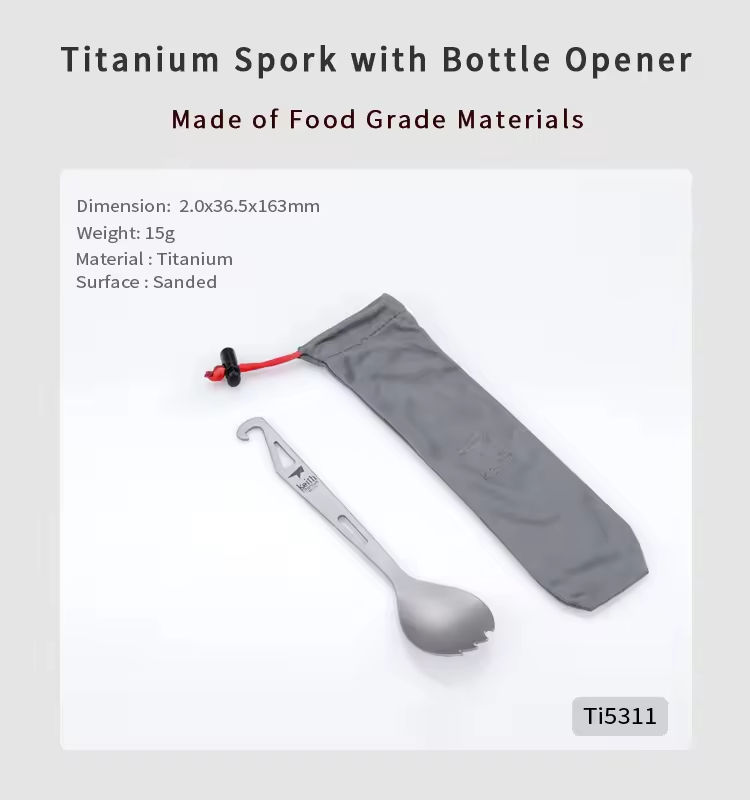 Description du produit:Fourchette-cuillère en titane avec décapsuleur