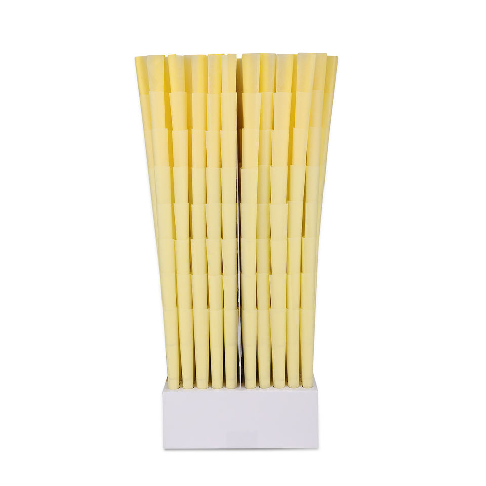 Cônes pré-roulés en papier biodégradable jaune de qualité supérieure 84 mm, filtre spiralé 0,5 g, 900 unités/boîte, estampage Vanishing
