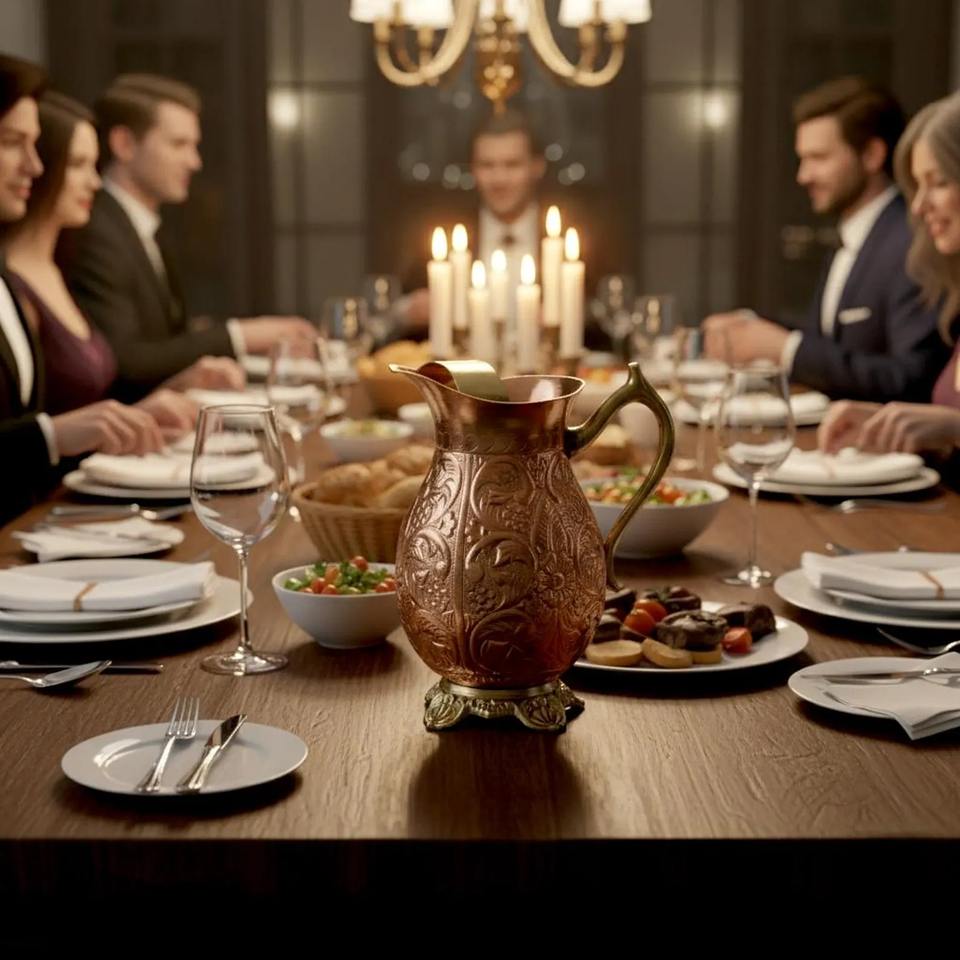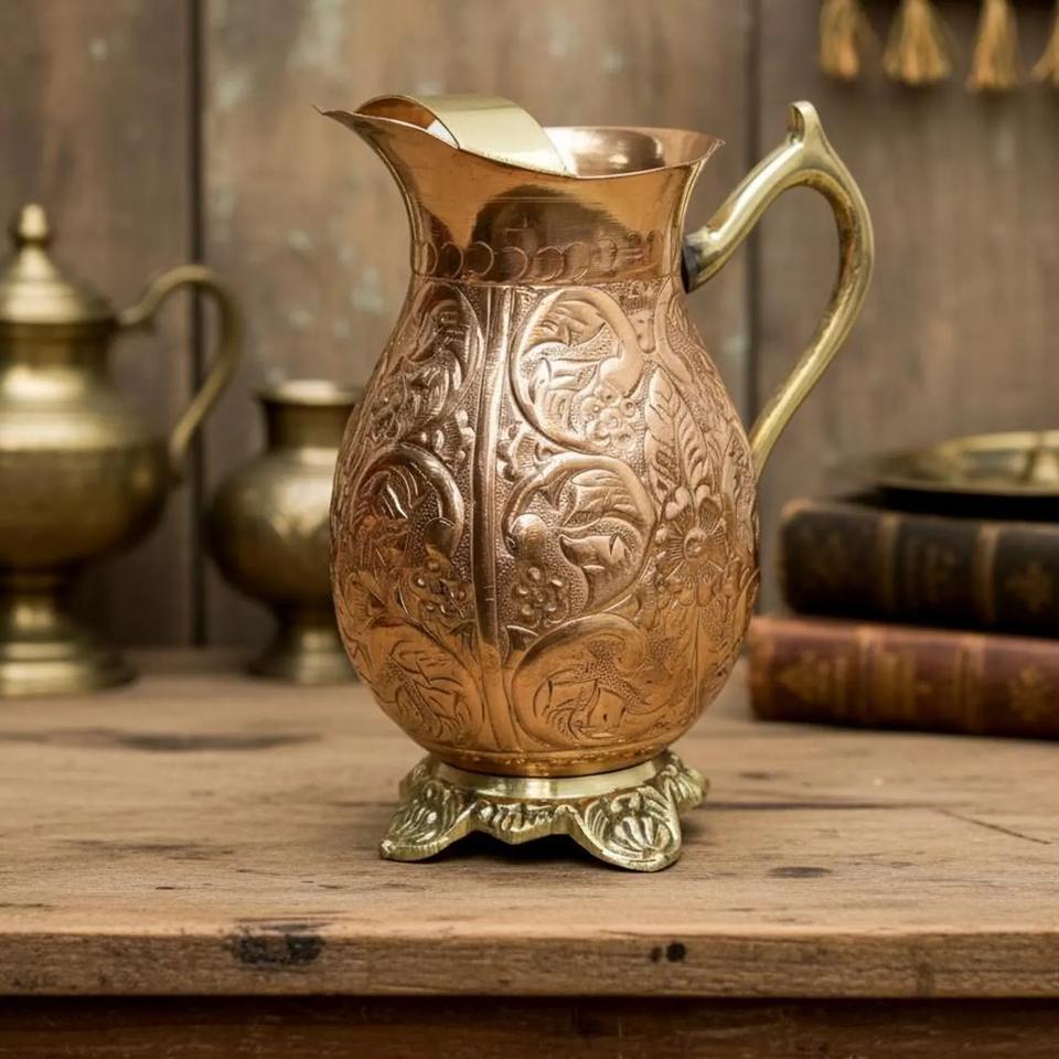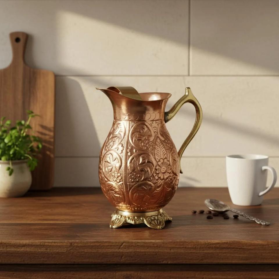Pichet en cuivre gravé de qualité supérieure, idéal pour les réceptions de mariage et les célébrations traditionnelles, fabriqué à la main en Inde