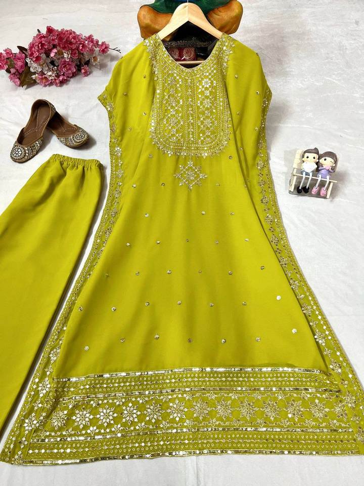 Kaftan de qualité supérieure en tissu lourd, de style designer, pour les occasions spéciales, en faux georgette, avec de magnifiques broderies de sequins et de zari, avec pantalon