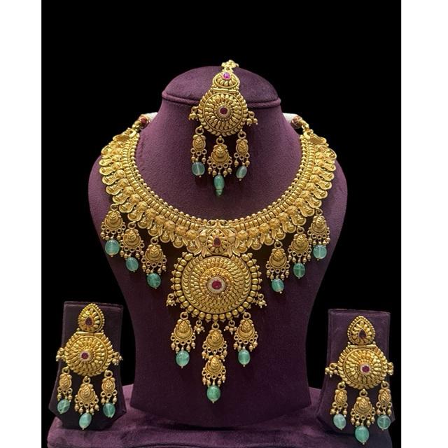 Ensemble de collier de créateur en plaqué or de qualité supérieure avec boucles d'oreilles et Tikka pour la collection de vêtements de mariage pour femmes