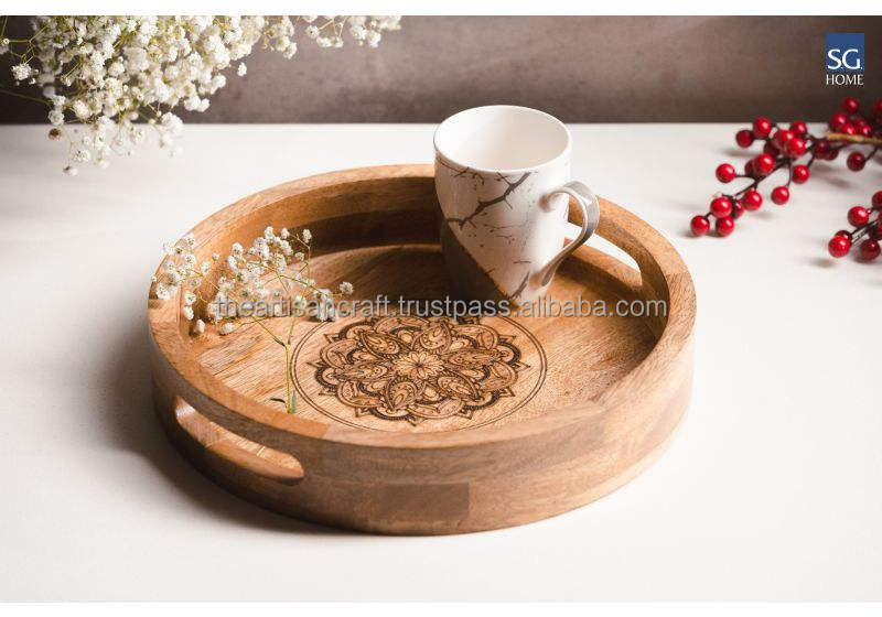 Plateau de service rond en bois de manguier durable fait à la main de qualité supérieure Artisanat artisanal Design moderne pour un usage domestique et le service des aliments