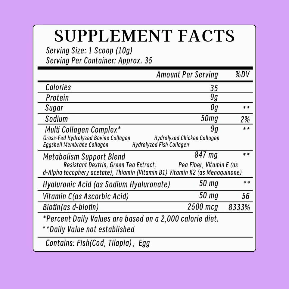 Ingrédient principal:Protéine, Biotine, Sodium, Complexe Multi Collagène, Mélange pour le soutien du métabolisme, Acide hyaluronique, Vitamine C