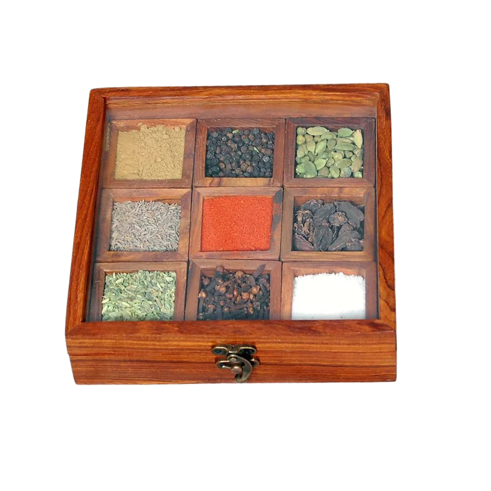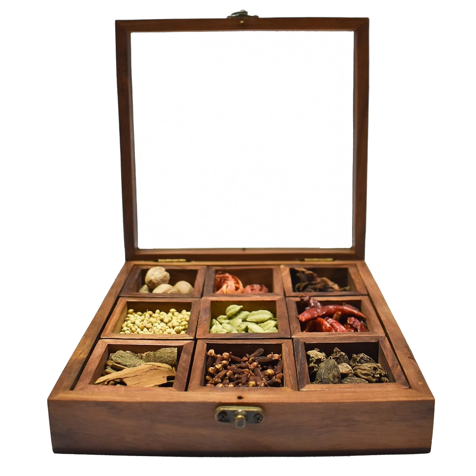 Boîte à épices en bois à 6 compartiments de qualité supérieure au dernier design boîte à épices en bois tradition indienne boîte Masala du marché indien