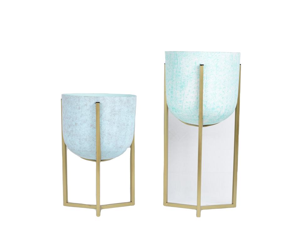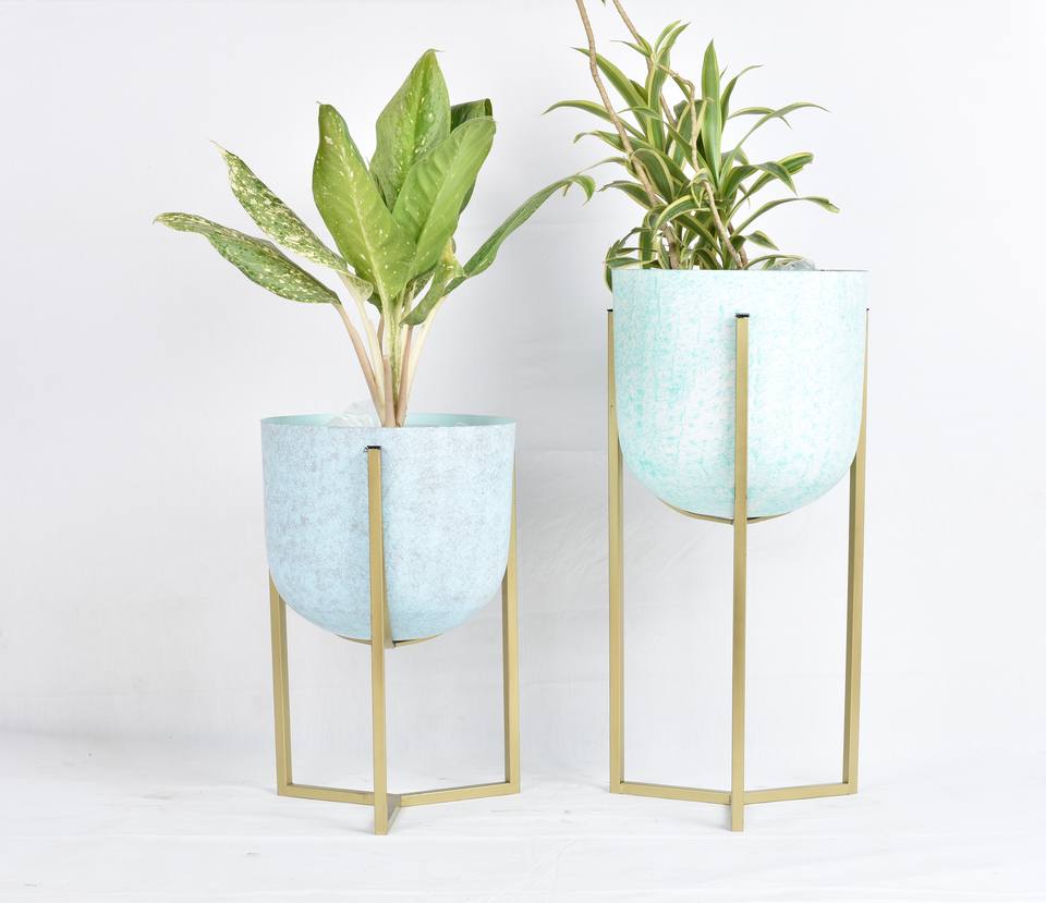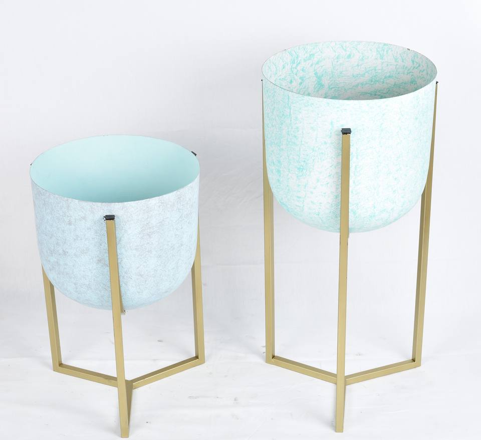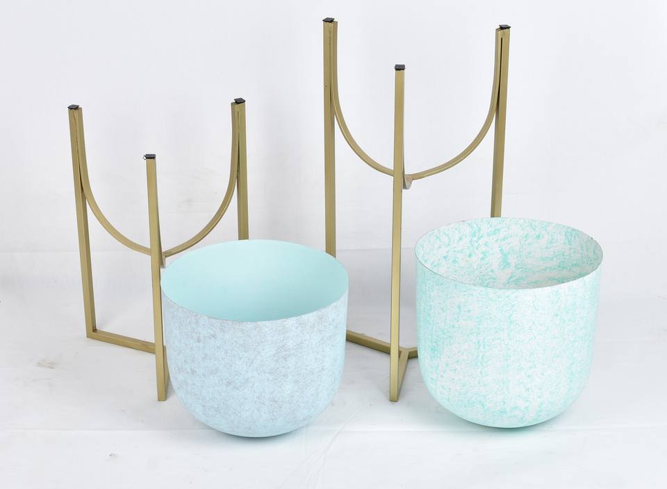 Jardinière en métal de qualité supérieure, finition bleu clair, durable, écologique, support en fer avec revêtement en poudre dorée, dernière tendance, vente chaude
