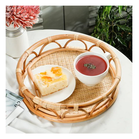 Plateau de service en rotin naturel de qualité supérieure avec poignée en bois, panier durable pour organiser le thé et les collations, idéal pour la table de cuisine