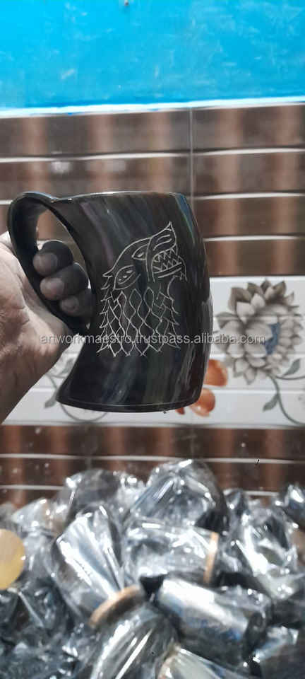 Chope en corne de buffle véritable de qualité supérieure, logo Odin God sculpté à la main, inspiré du viking, Valhalla, idéale pour la culture viking