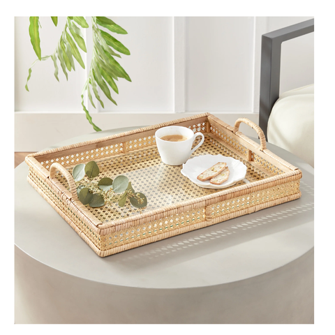 Plateau de service rectangulaire en rotin de qualité supérieure, tressé à la main, avec poignées en bois, écologique, pour cuisine, thé, café, plateaux décoratifs