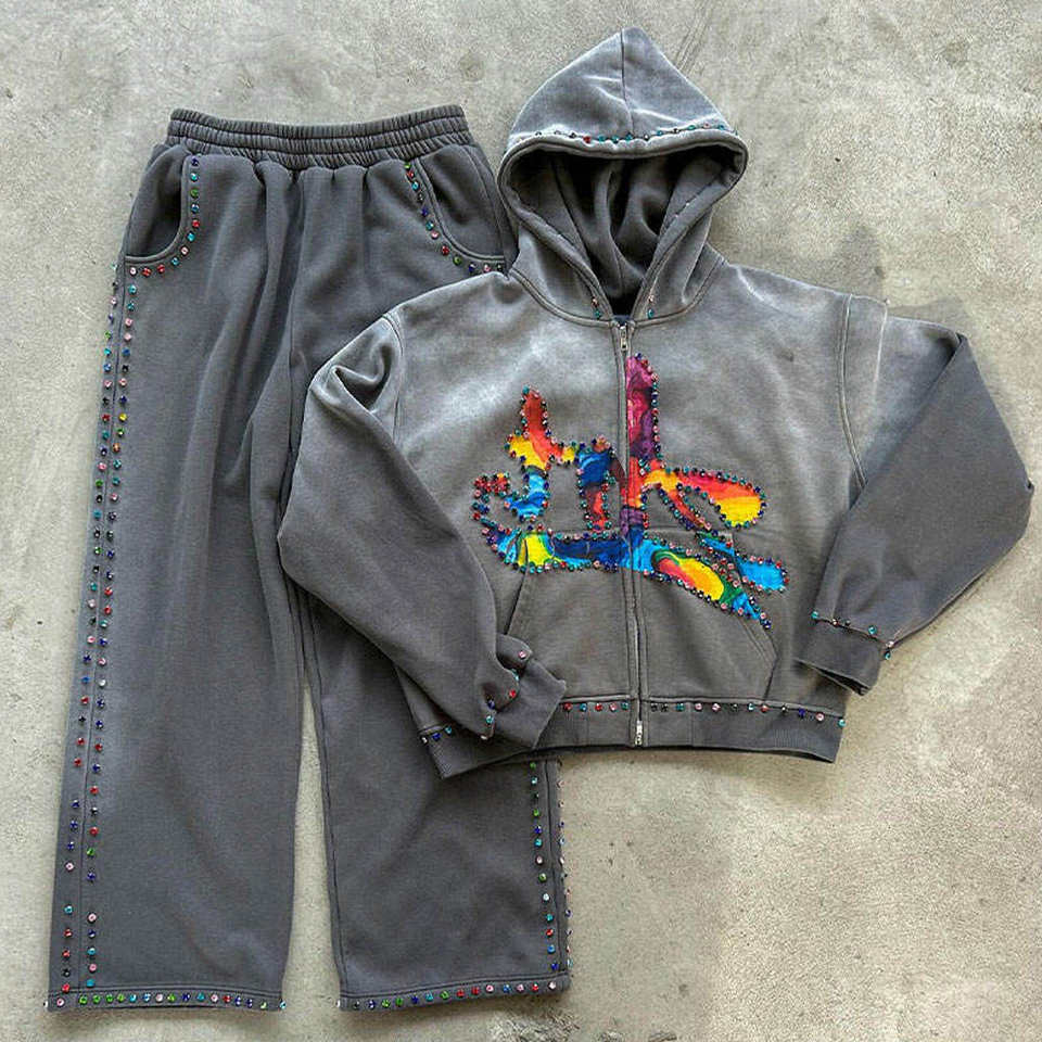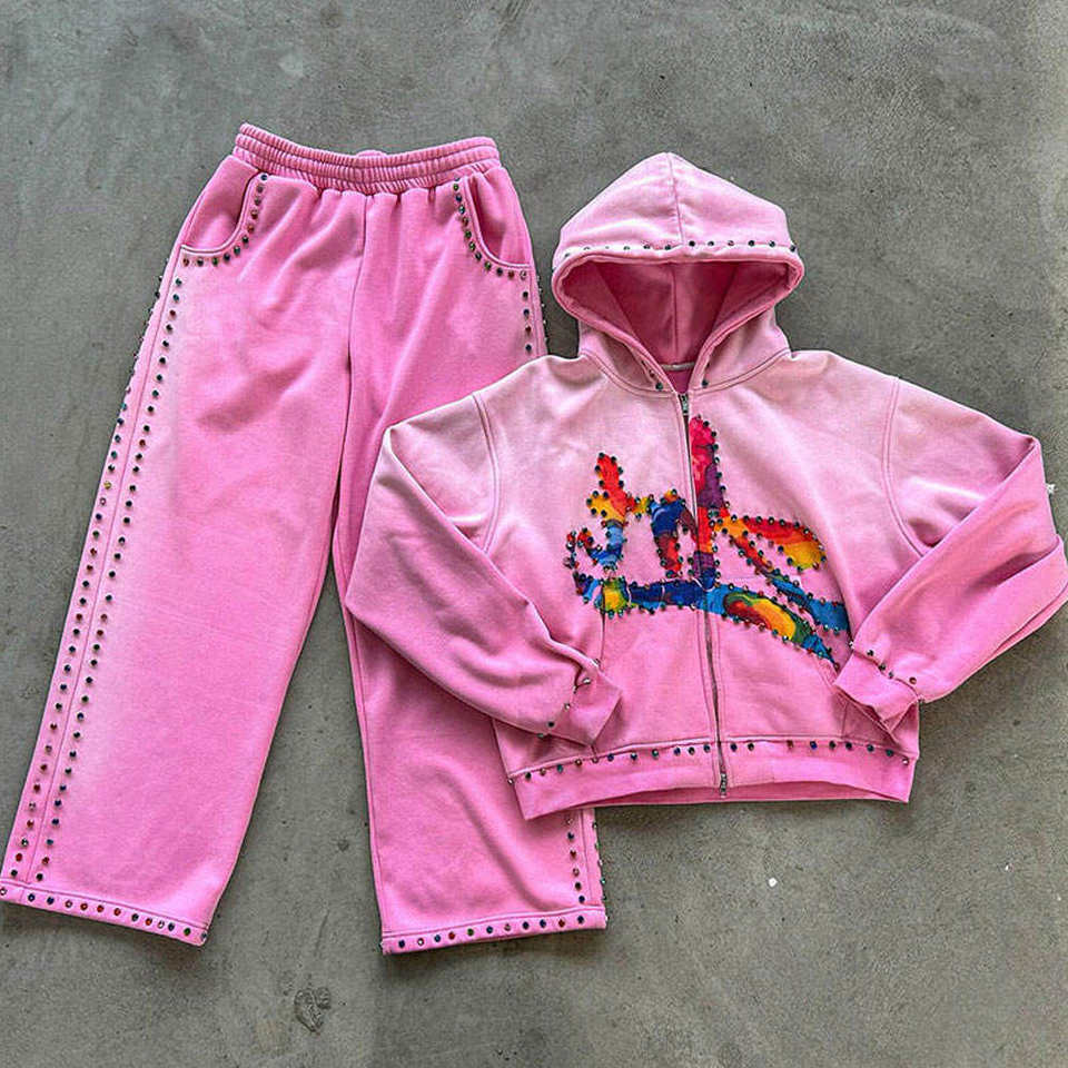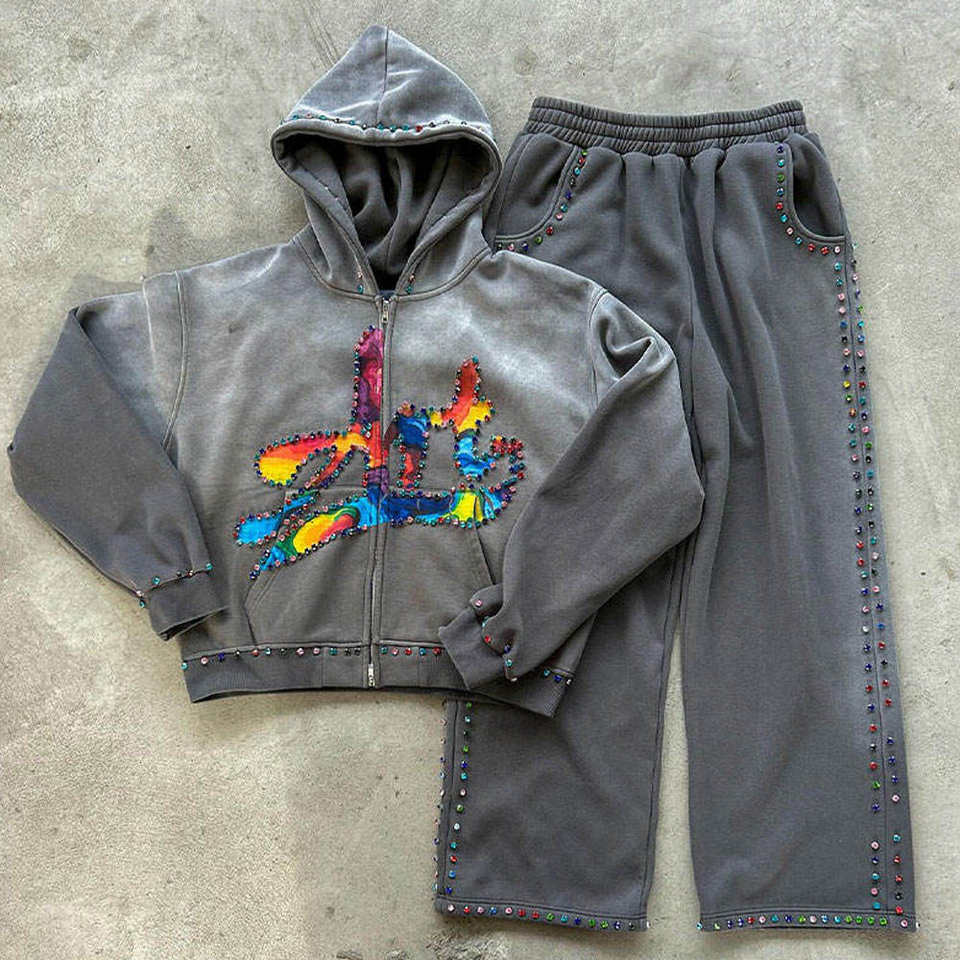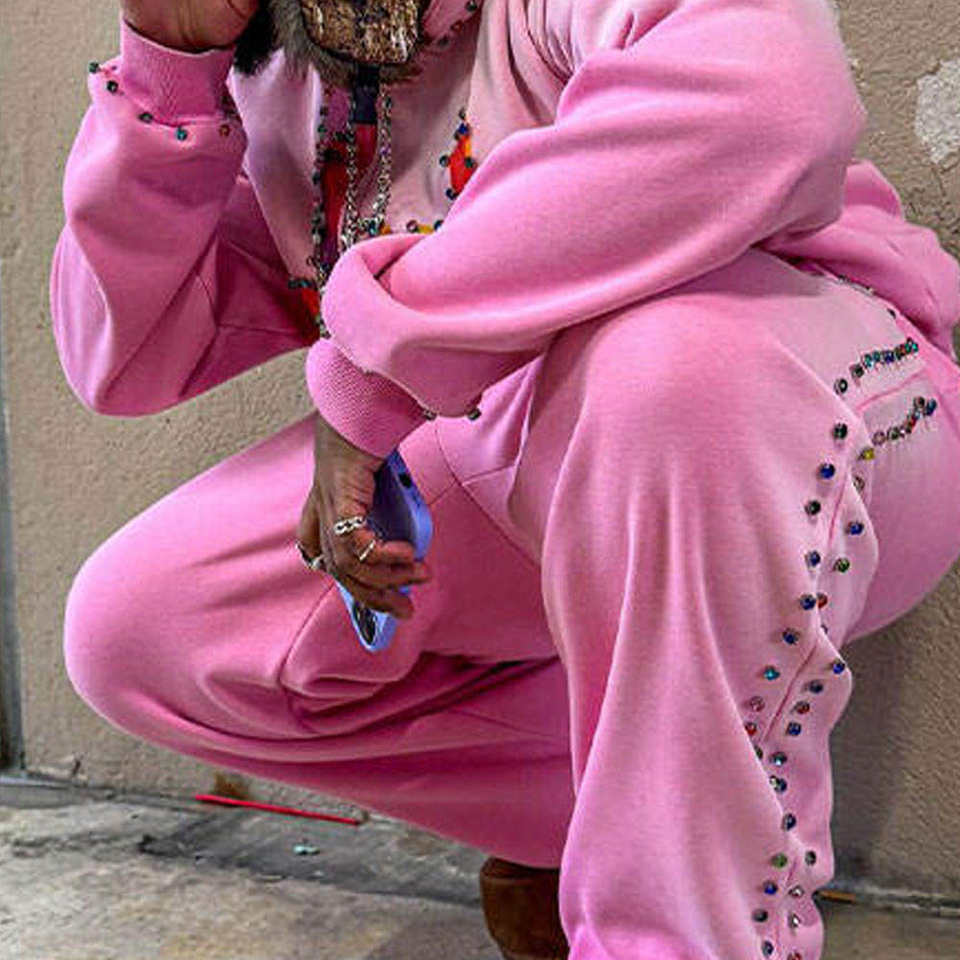 Ensemble de survêtement élégant et scintillant en strass de qualité supérieure pour femmes, coupe ajustée, sweat à capuche et pantalon en strass, survêtements en strass