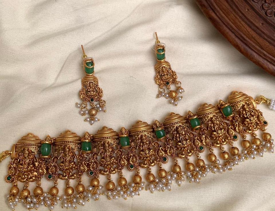 Luxury Women's Wedding Wear Set Premium Quality Traditional Design Choker Earrings Pearl Look Temple Jewelry Brass Strand Chain