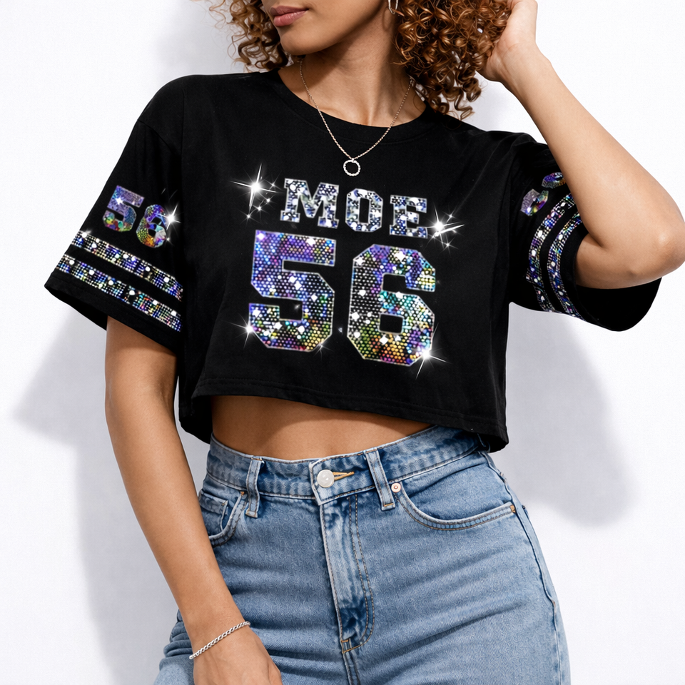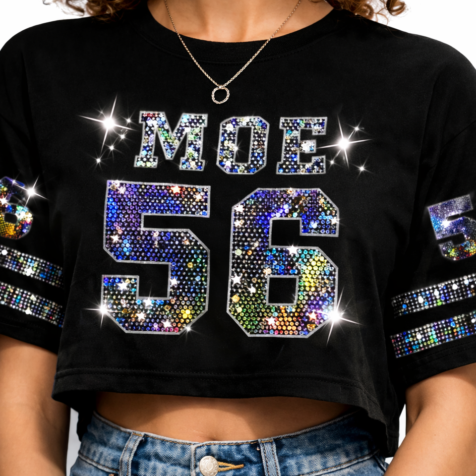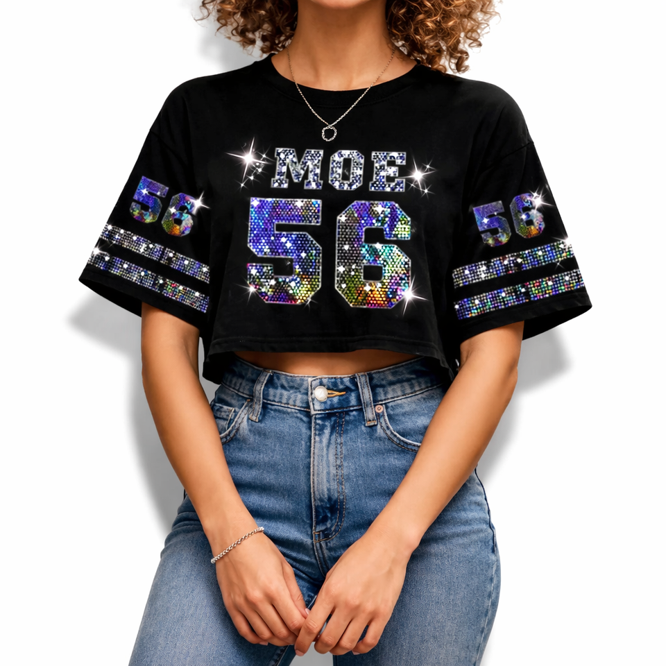 Maillot de football américain court pour femme de qualité supérieure avec strass, numéro personnalisé à paillettes, haut streetwear, marque privée, OEM, vente en gros