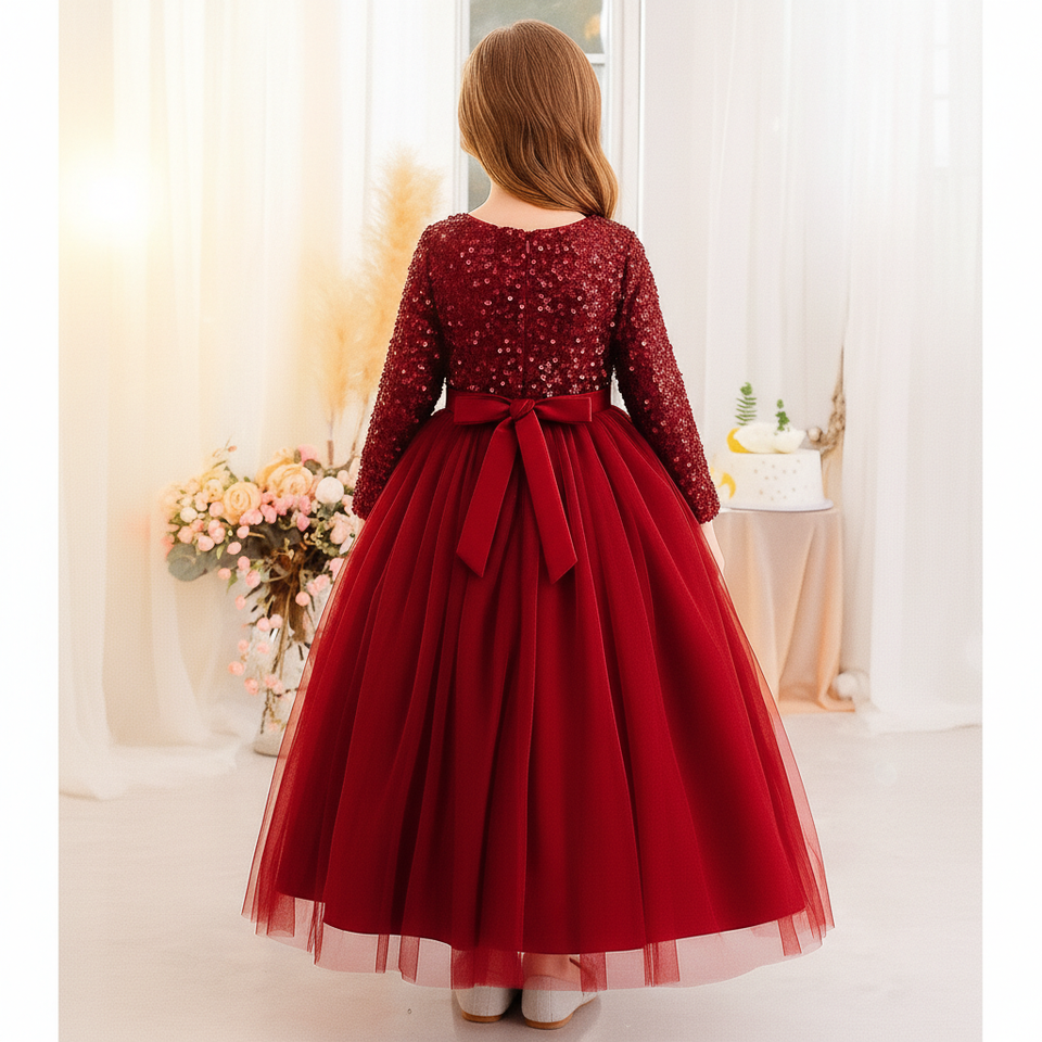 Robe de soirée princesse en velours rouge premium brodée de sequins et de dentelle douce à col en V pour filles, vente en gros OEM ODM