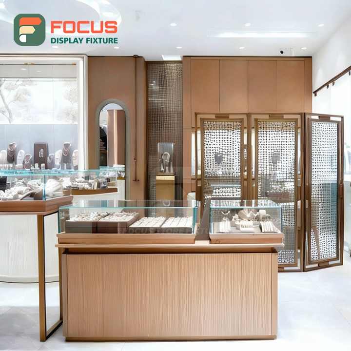 Vitrine de présentation de bijoux haut de gamme, moderne, en bois, verre et métal, avec éclairage LED, pour boutique de luxe, présentation intérieure