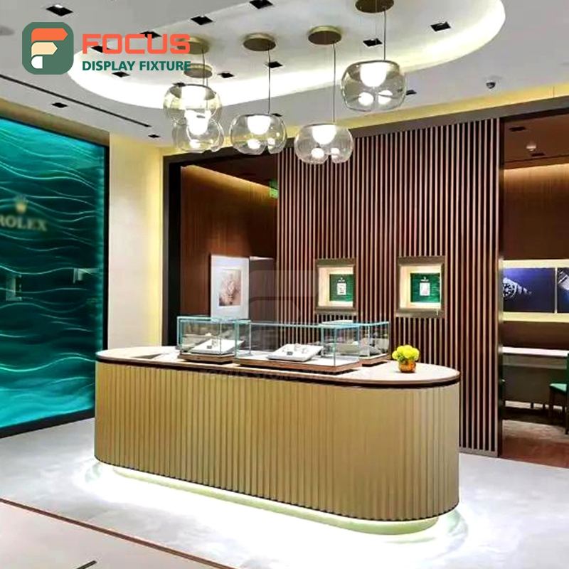 Comptoir de présentation de bijoux en bois haut de gamme avec vitrine en verre et présentoir métallique pour centre commercial