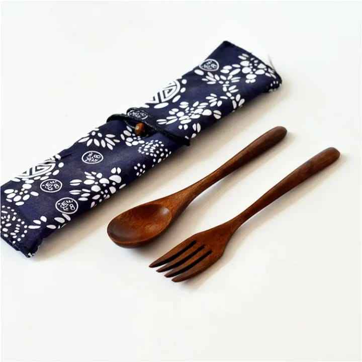Ensemble de couverts en bois réutilisables de qualité supérieure, cuillère et fourchette en bois dur naturel fabriquées à la main avec des poignées enveloppées de fil de style japonais