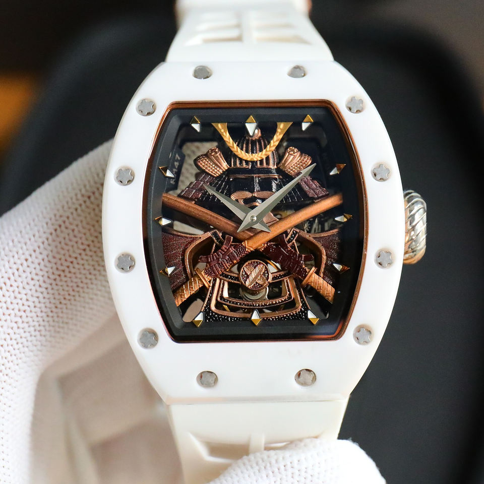 Montre-bracelet de luxe pour homme, en céramique blanche, forme barillet, cadran squelette, design armure de samouraï, sport, avec vis décoratives