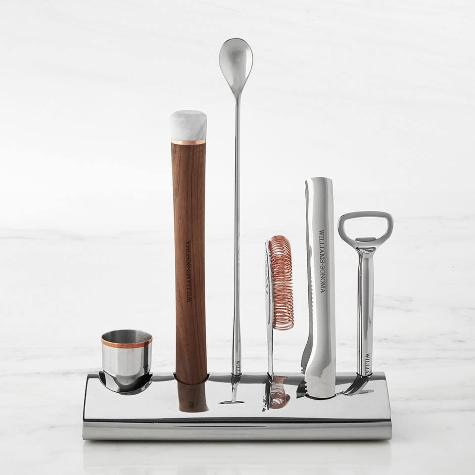 Ensemble d'outils de bar en acier inoxydable de qualité supérieure avec support en bois, accessoires professionnels pour la préparation de cocktails, élégant et indispensable pour le bar