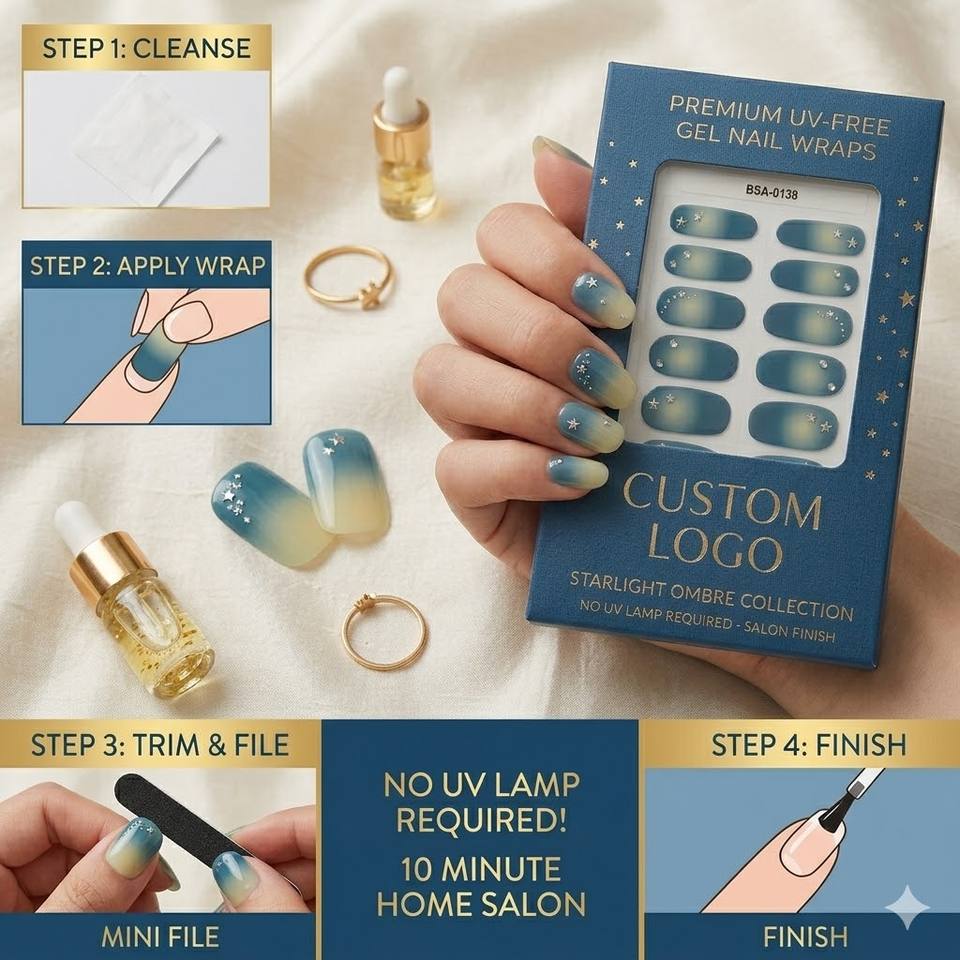 Autocollants pour ongles en gel ombré Starlight de qualité supérieure, accents étoiles argentées, longue durée, sans UV, pour nail art DIY, marque privée personnalisée