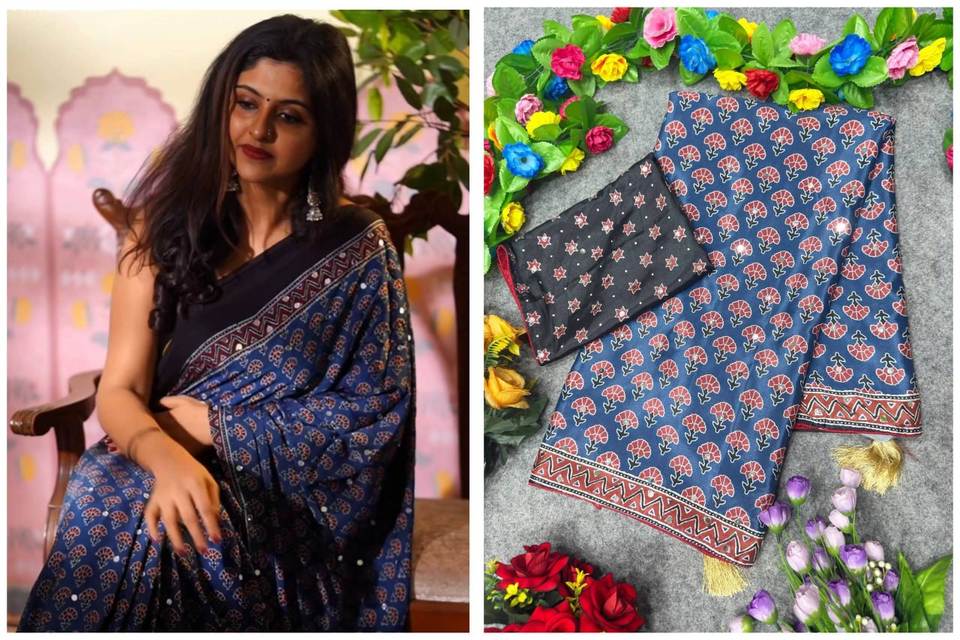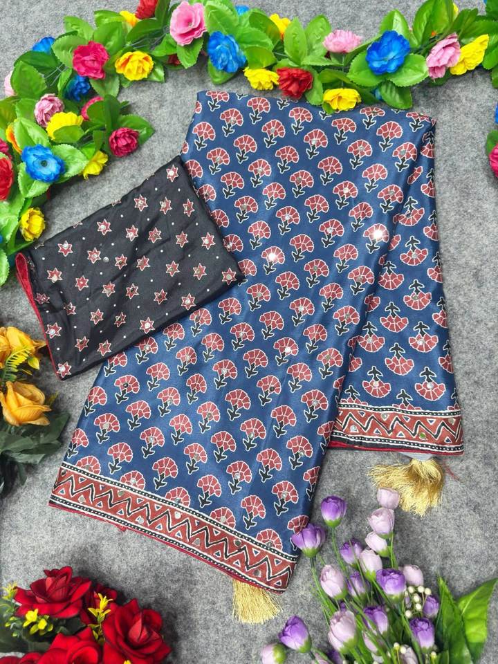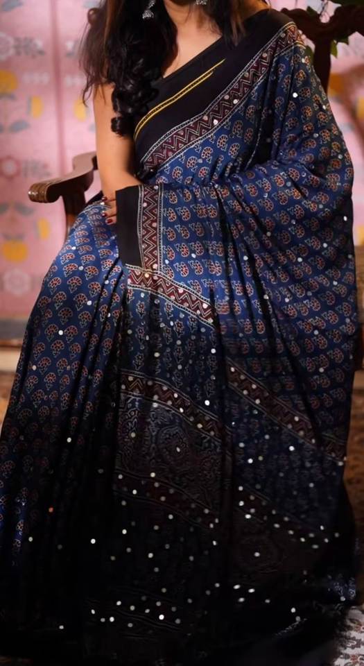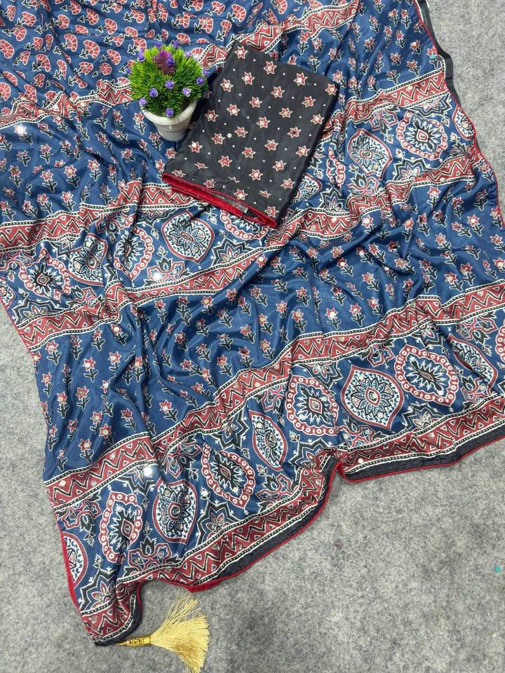 Sari en Soie Chinon Douce de Qualité Supérieure, Longueur Cheville, Infroissable, Broderie de Paillettes, Imprimé Ajrakh, Élégant pour Soirées, Non Cousu