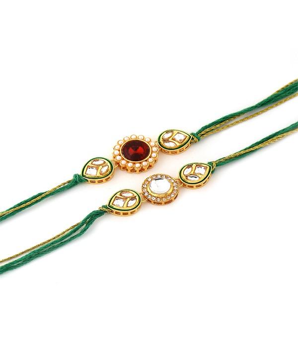Rakhi Kundan Traditionnel Premium avec Broderie Fil Vert, Spécial Raksha Bandhan, Fil Fait Main par un Designer pour Frère