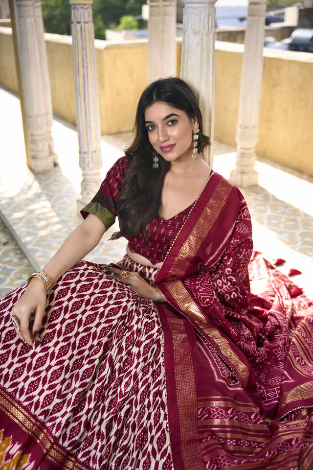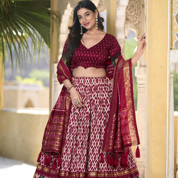Dupatta work:Ikkat Print With Foil Work And Gotta Patti Lace Border with tassels