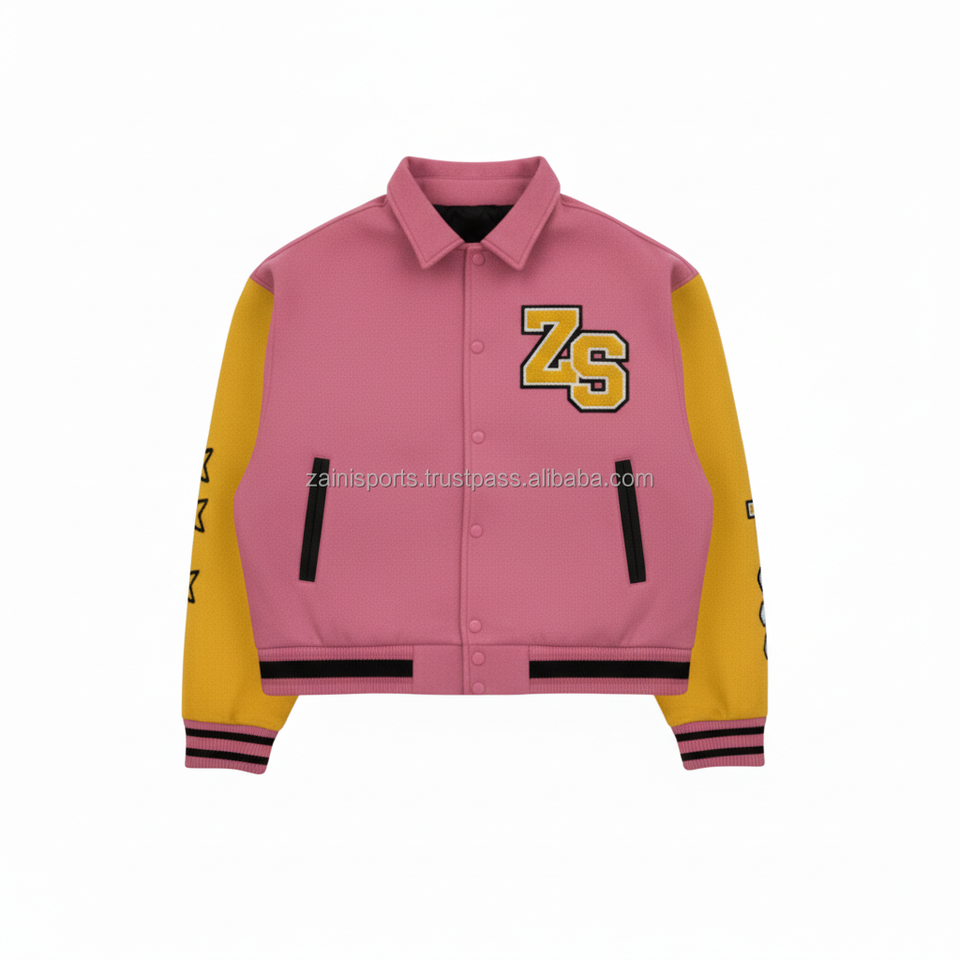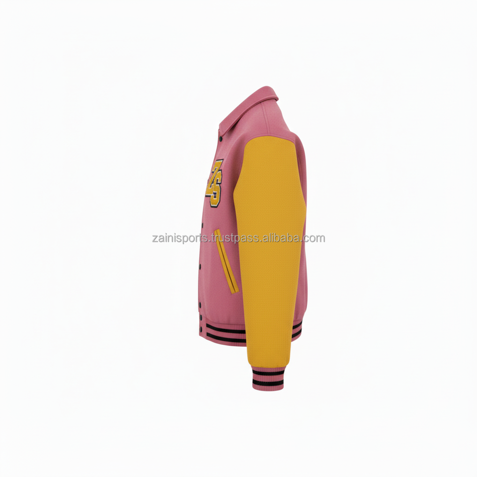 Veste universitaire en mélange de laine avec manches en cuir PU souple, veste universitaire en chenille à logo personnalisé jaune rose pour hommes