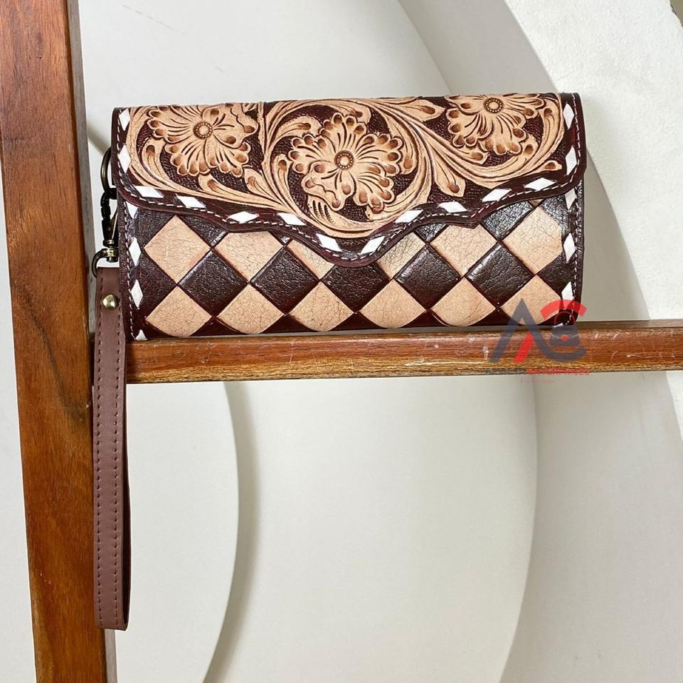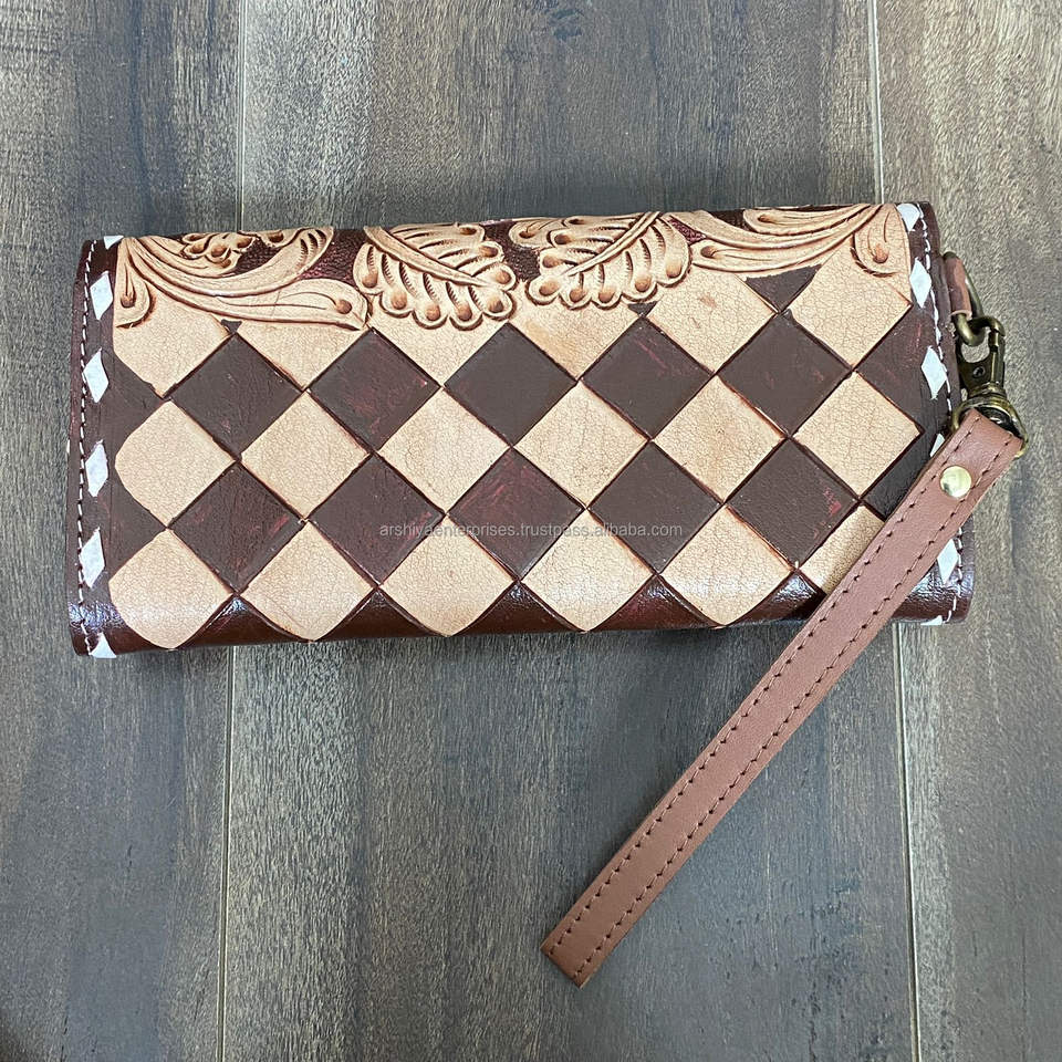 Product name:Hand Tooled Checkered Leather Wristlet Wallet