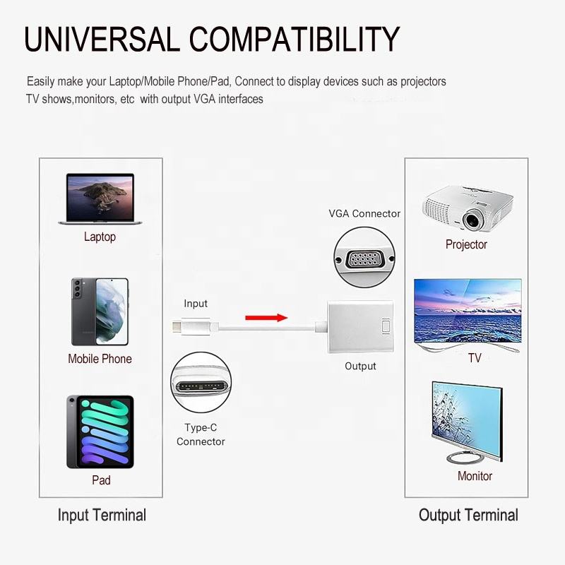 Adaptateur Convertisseur USB 3.1 Type C USB-C vers VGA de Qualité Supérieure pour Macbook Pro Air Surface Laptop Téléphone Mobile Tablette