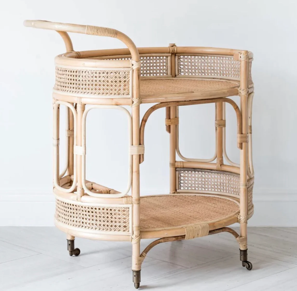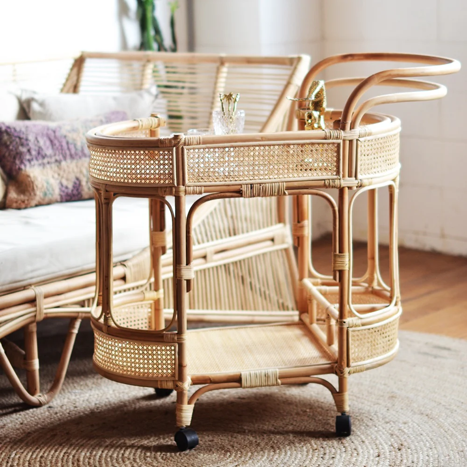 Chariot à boissons en rotin en osier de qualité supérieure Chariot de service fait à la main pour les planificateurs d'événements, les studios de design et les salles à manger raffinées