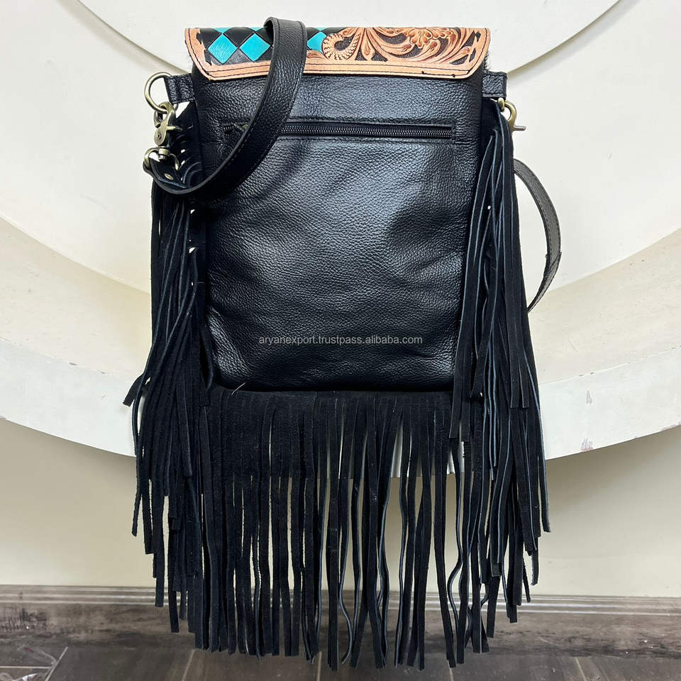 Product name:Hand Tooled Leather Fringe Checkered Crossbody Bag