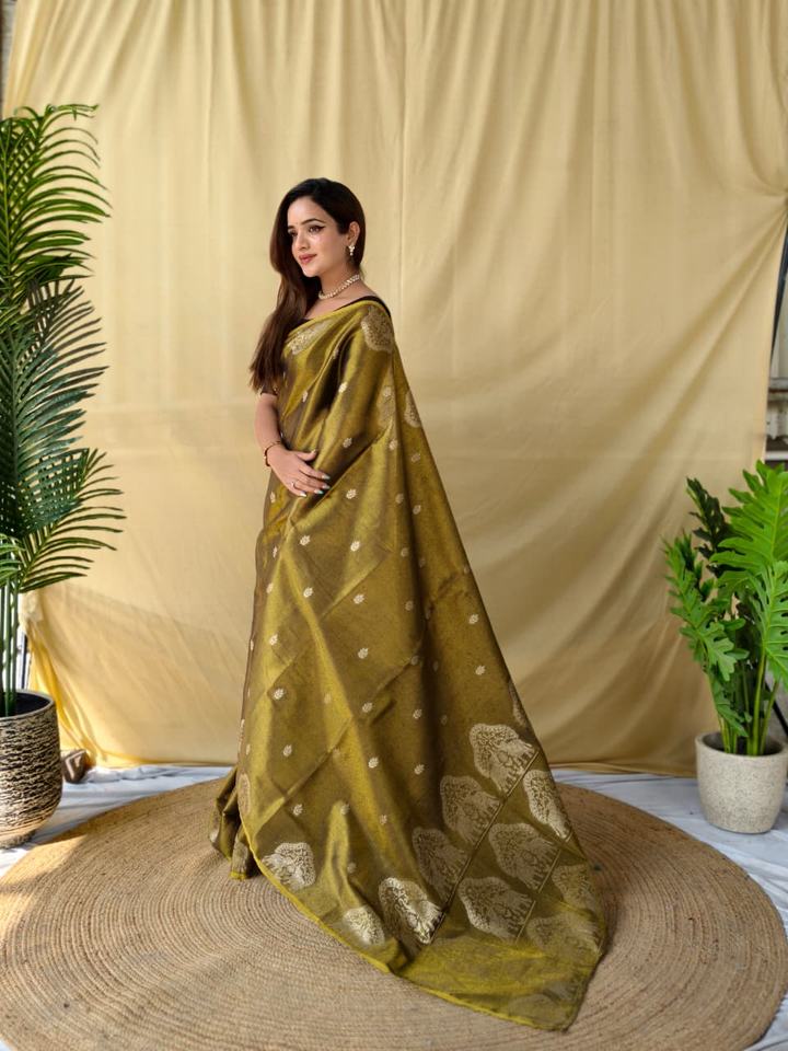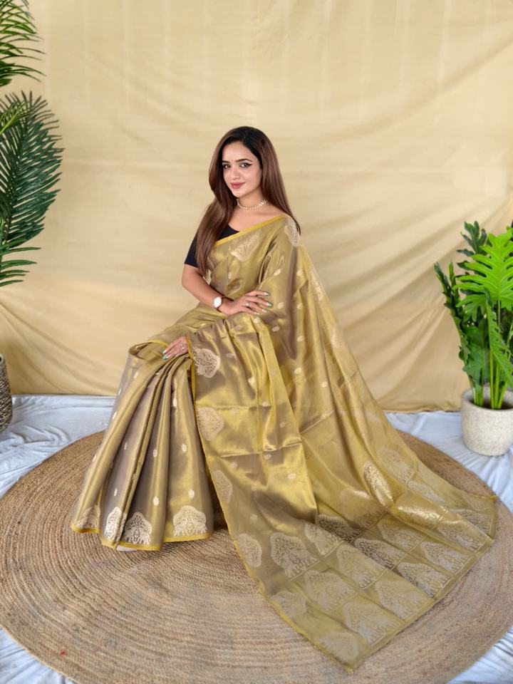 Premium Women's Zari Tissue Weaving Saree with All Over Elephant Pattern and Flower Butti on the Body Made in India