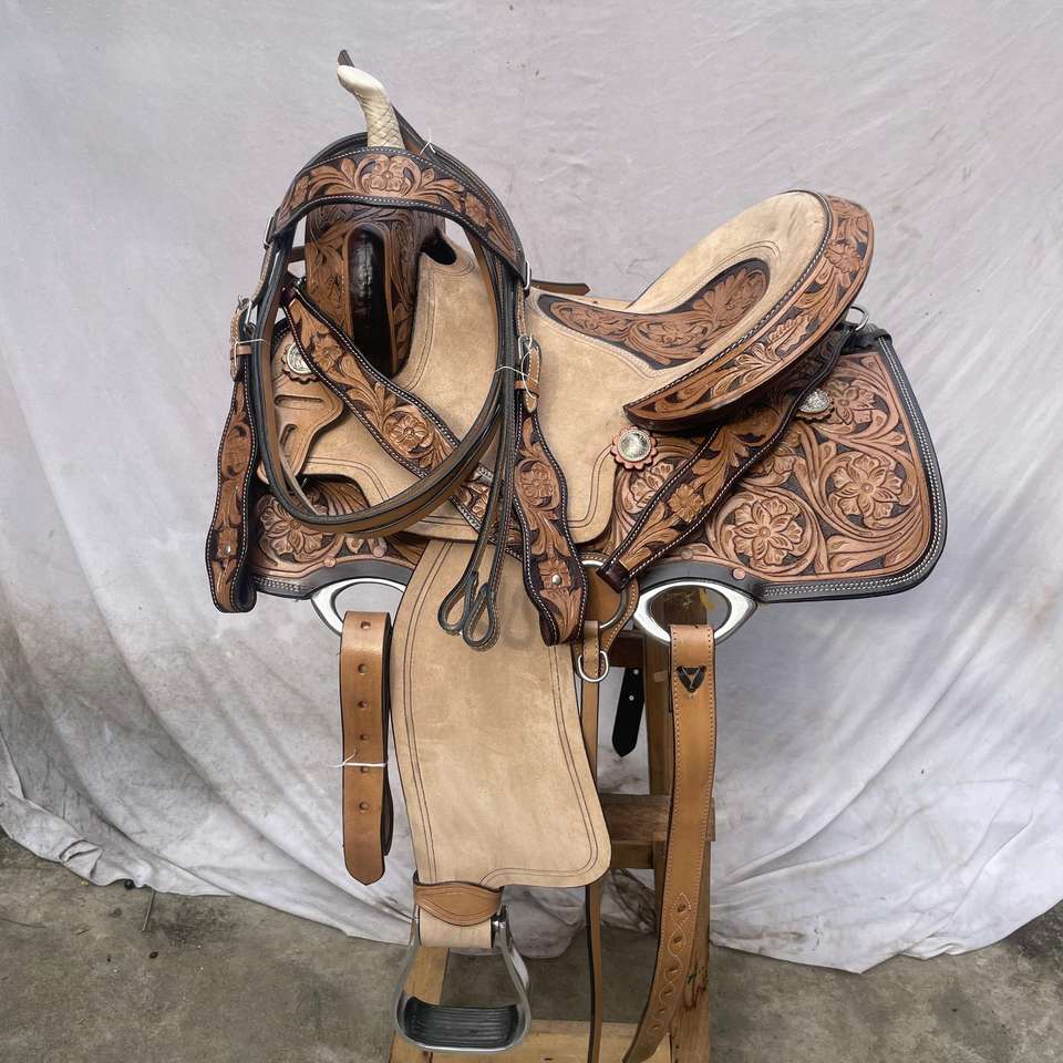 Ensemble de sellerie western en cuir avec cadre en bois de qualité supérieure et motif de course de barils | Accessoires en acier inoxydable façonnés à la main, ensemble de tack gratuit pour chevaux