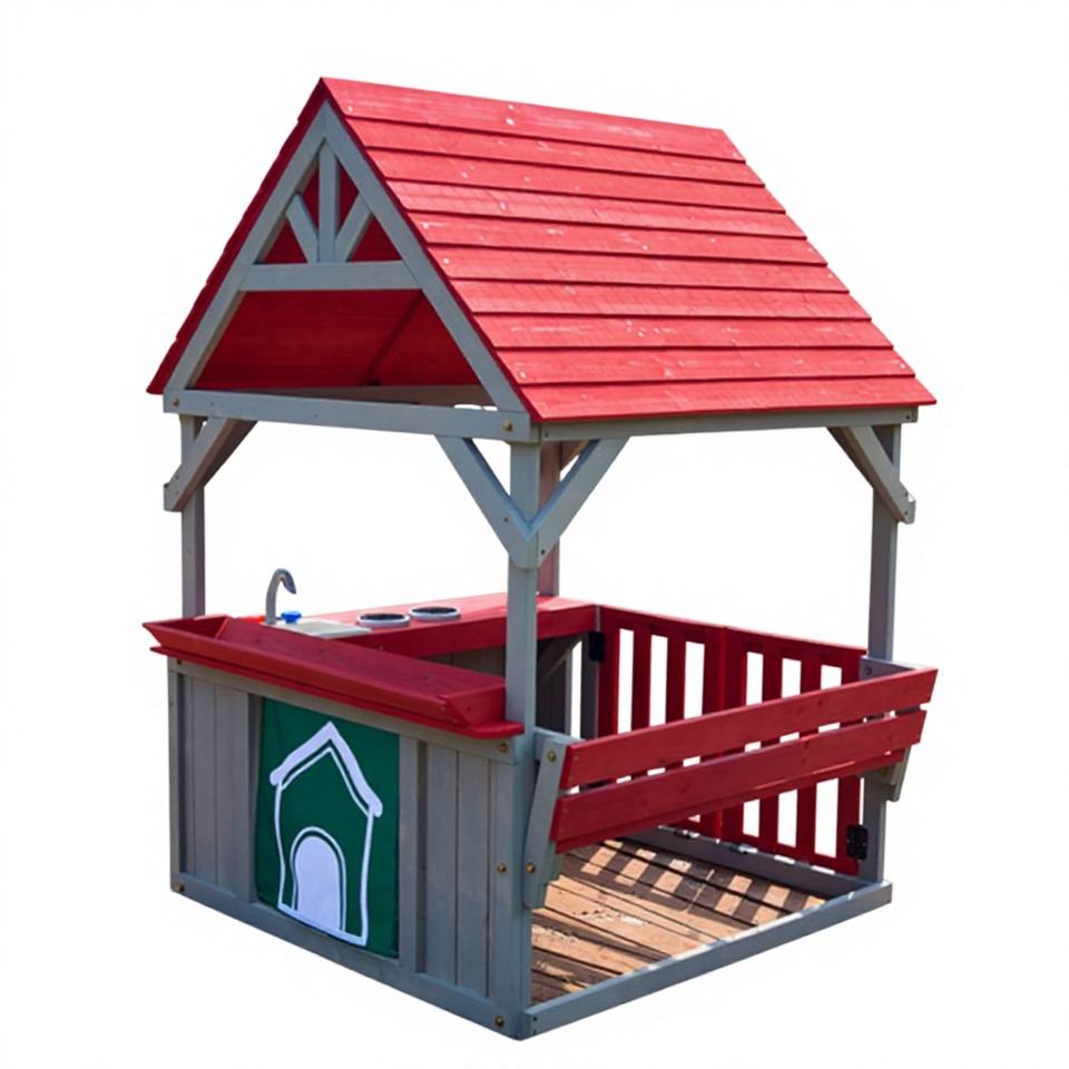 Cuisine de jeu extérieure en bois écologique haut de gamme, convertible en banc, avec toit rouge, évier et cuisinière de jeu - Maisonnette de jeu pour enfants de 3 à 8 ans