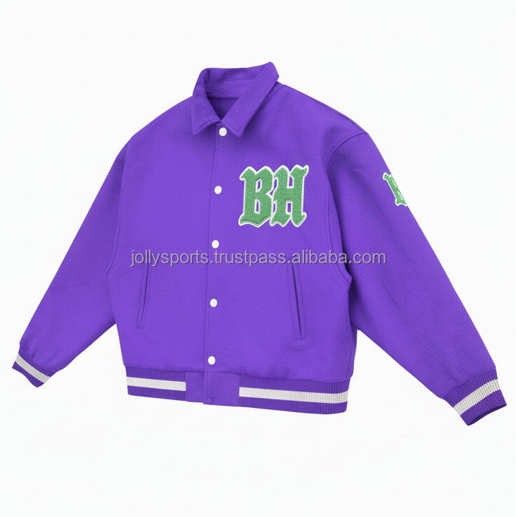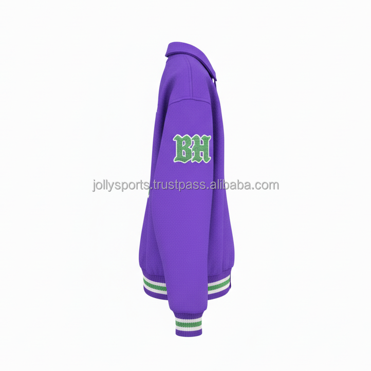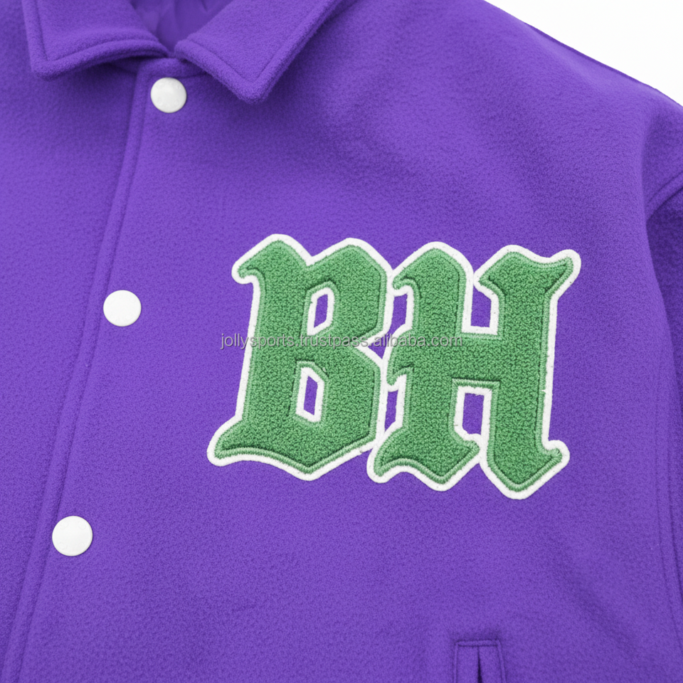 Veste universitaire en mélange de laine de qualité supérieure 420 GSM polaire douce intérieure couleur violette Logo personnalisé fermeture à broderie vestes universitaires pour femmes