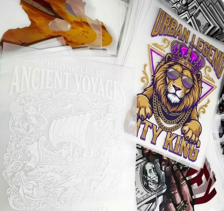 Film de transfert thermique Premium avec plastisol et verre pour streetwear lavable, motifs Couronne, Lion, Cigare, Argent pour vêtements foncés