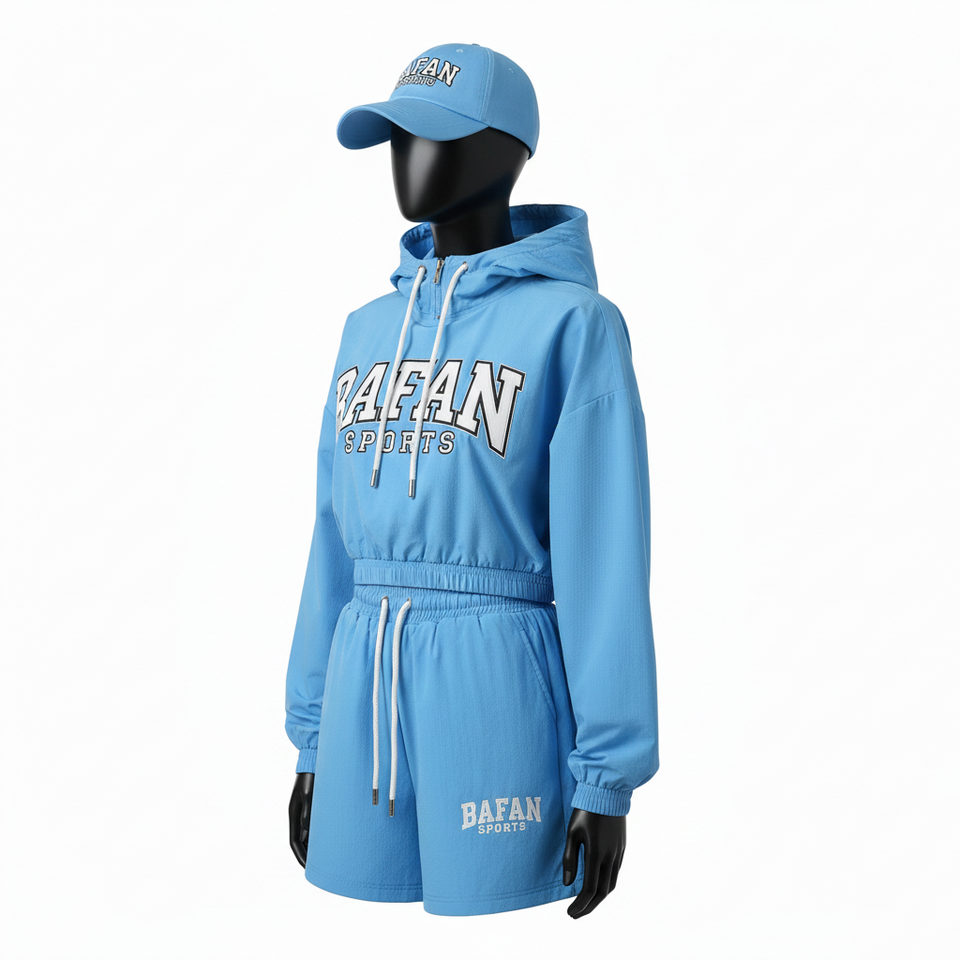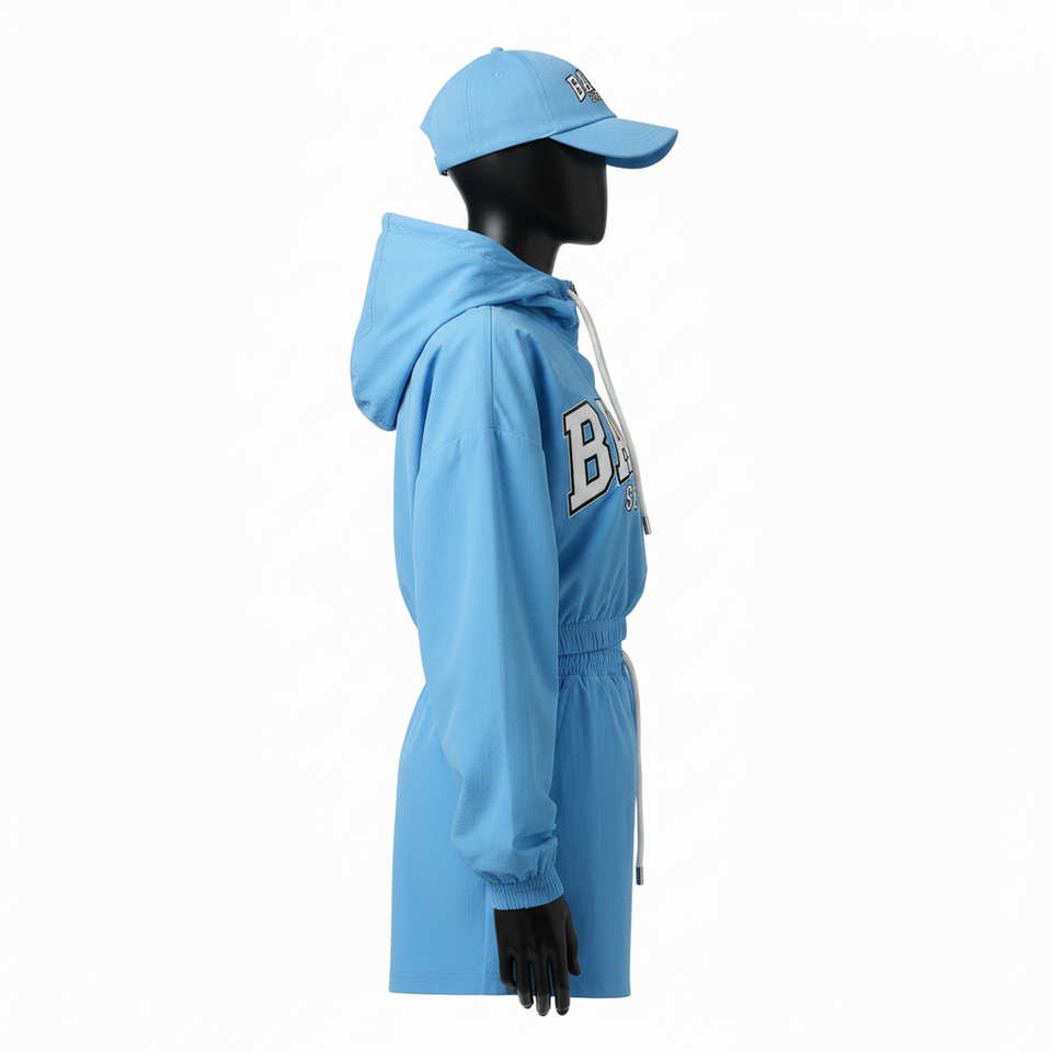 Ensemble court coupe-vent en nylon polyester premium, tissu léger tissé, bleu ciel, sweat à capuche et short avec logo personnalisé appliqué, grandes tailles