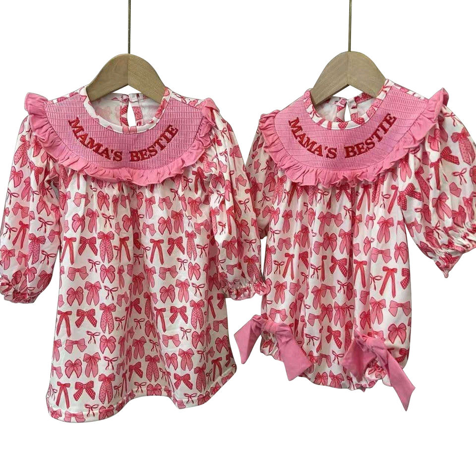 Précommande MAMAS BESTIE Coquette arcs rose petites filles tenues bébé smocké bulle barboteuse soeur correspond bébé vêtements nouveau Design