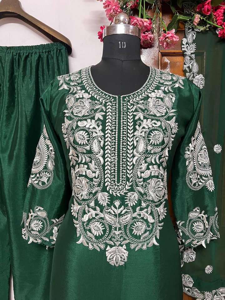 Product Name:Chinon Silk Thread Embroidery Top And Palazzo With Dupatta