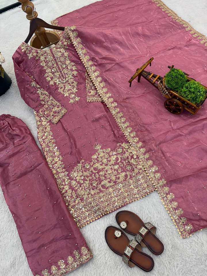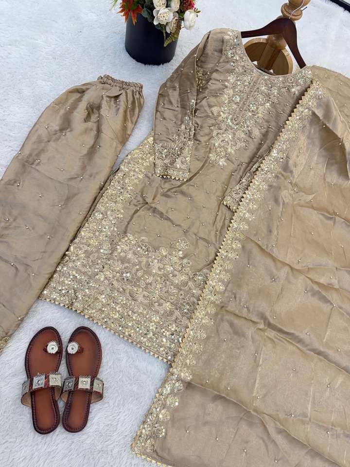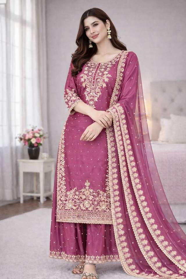 Présentation de la nouvelle collection de créateurs en soie avec broderies lourdes et travail de codage séquentiel, ensemble haut-bas et dupatta.