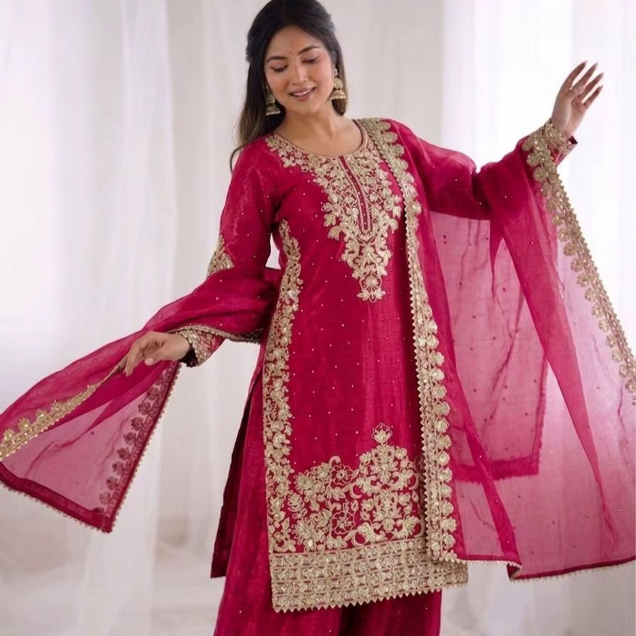 Présentation de la nouvelle collection de créateurs SILK avec un ensemble haut-bas et dupatta entièrement brodé et orné de motifs complexes, entièrement cousu.