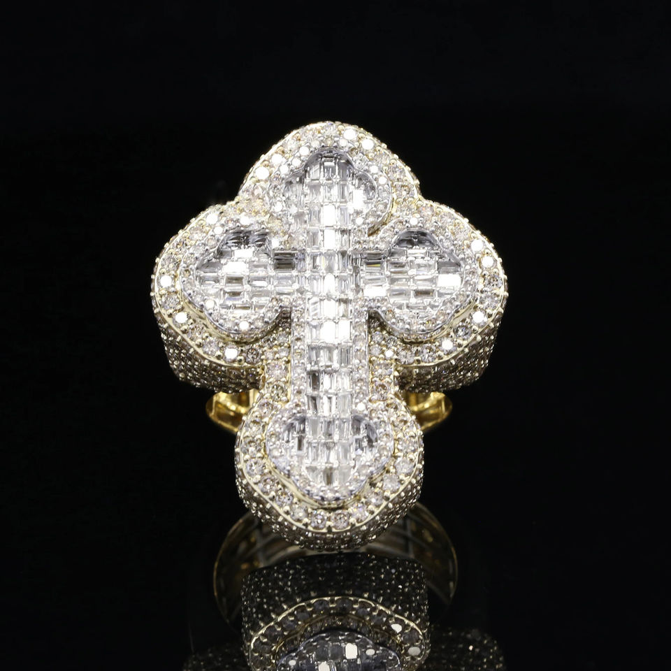 Présentant l'original Hip Hop Jesus Cross Ring Bust Down By Round And Baguette Cut Moissanite Diamond In 14kt Yellow Gold