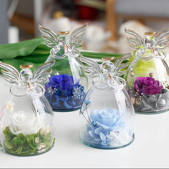 Roses Préservées en gros Cadeau Design Unique Petit Ange Dôme en Verre Préservé Rosas Éternelles Naturelles Véritables Fleurs Préservées
