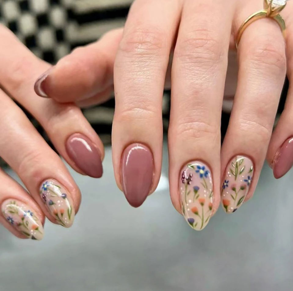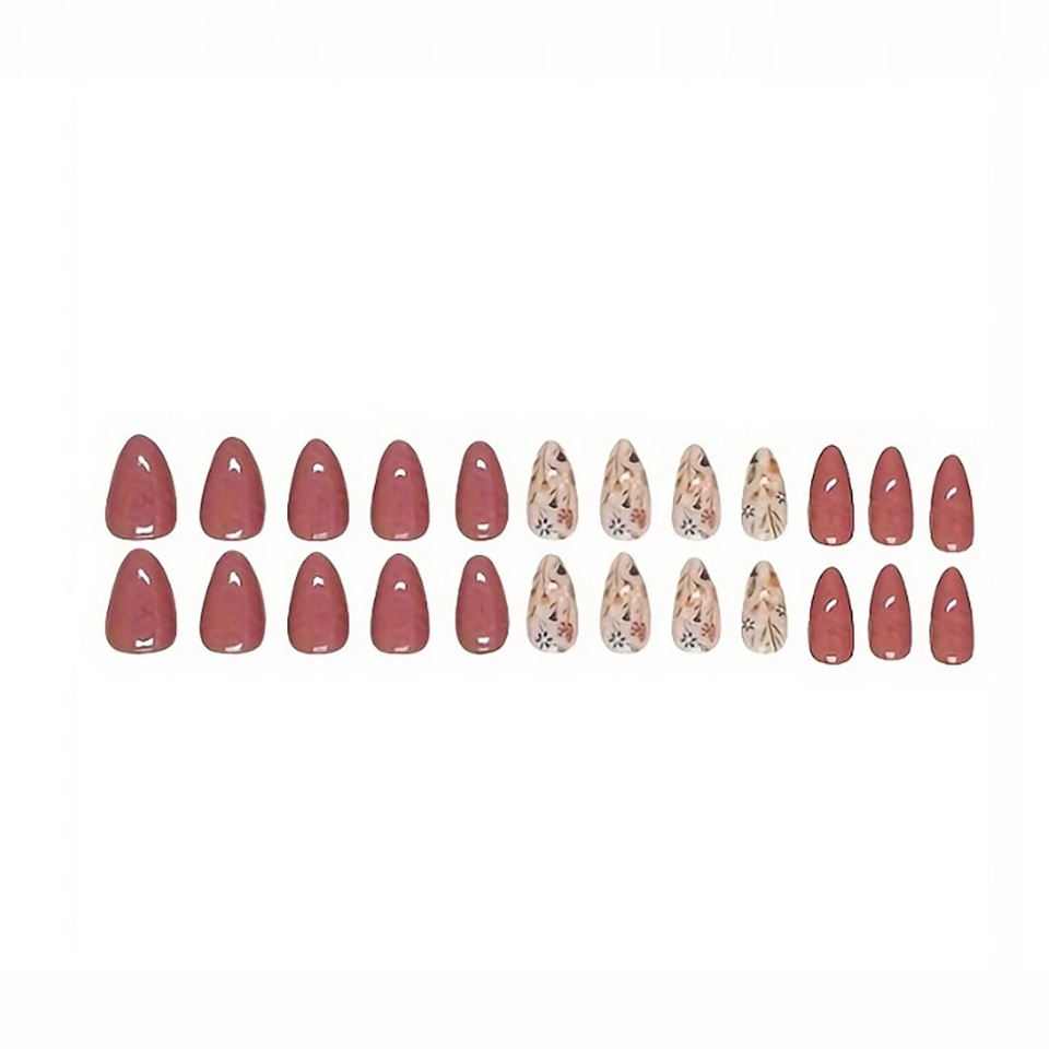 Faux ongles à presser courts en amande avec motif floral brillant, réutilisables, couvrance totale, en acrylique, à coller pour femmes
