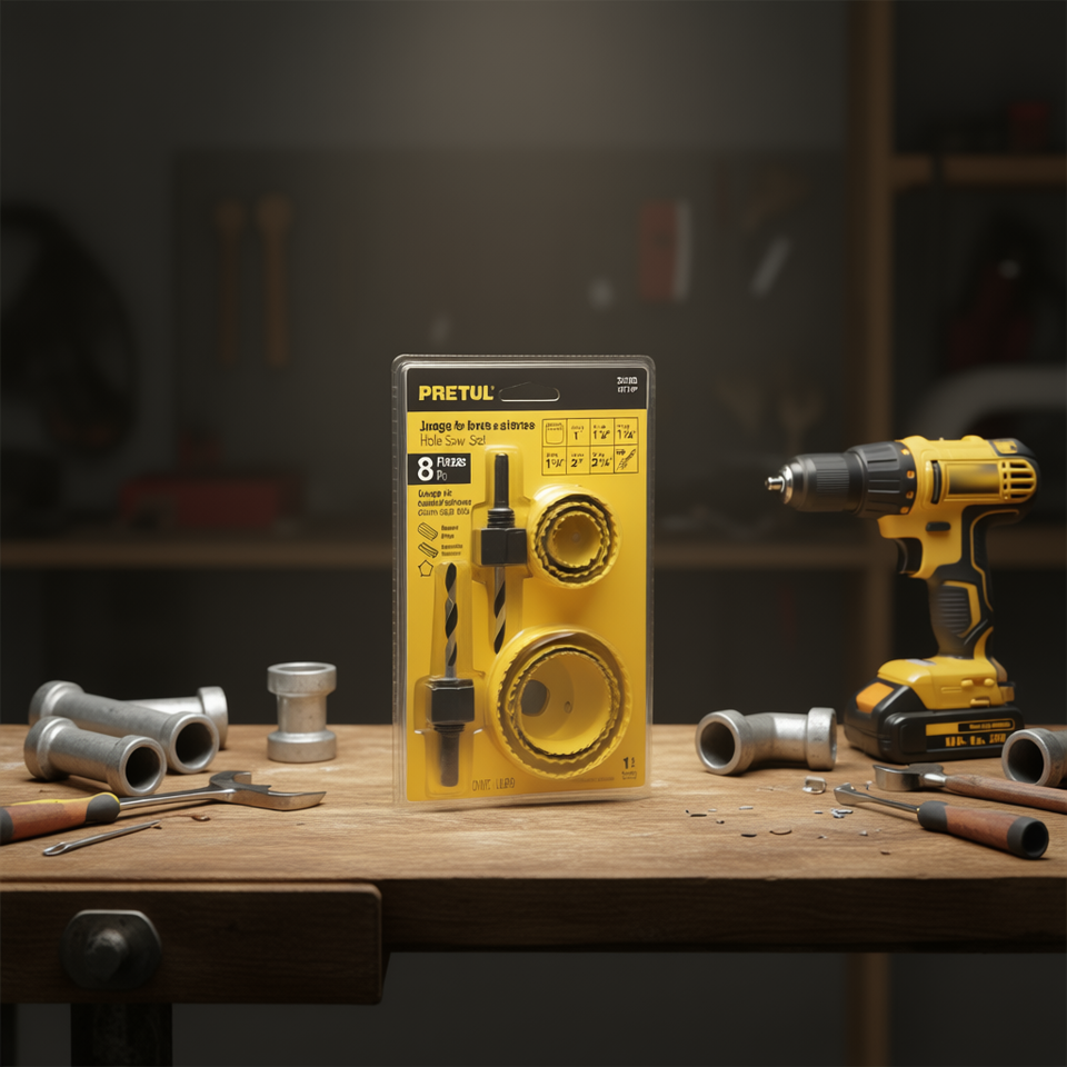 Kit de scie cloche Pretul 8 pièces avec forets en acier au carbone et mandrin pour la découpe du bois, comprend 7 scies et 1 arbre, mesure impériale