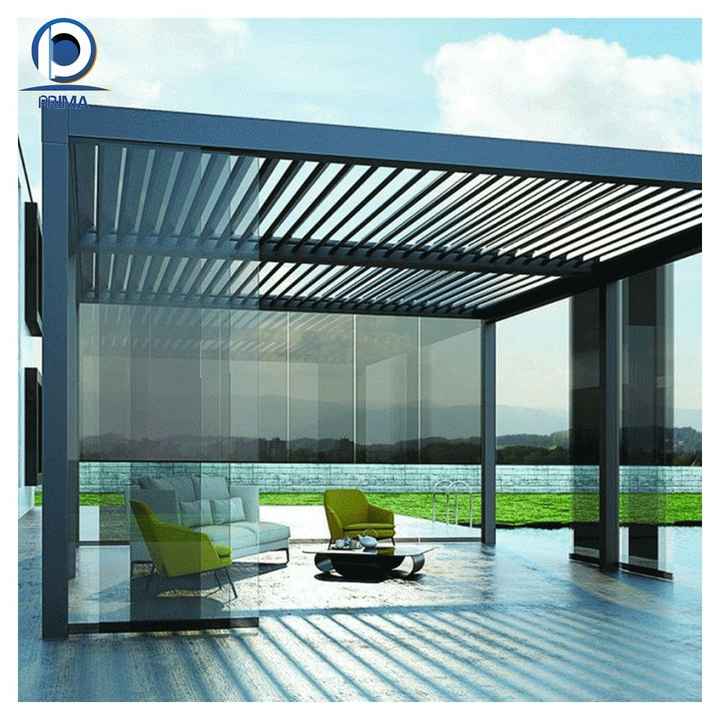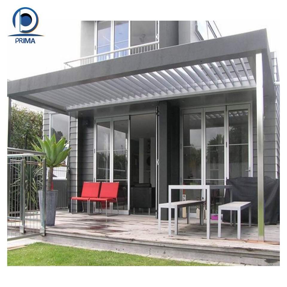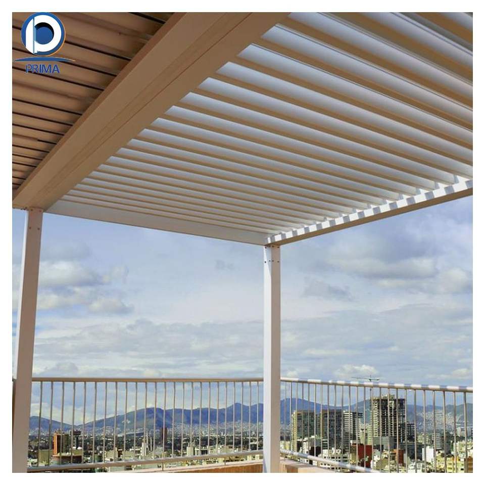Pergola motorisée automatique à panneaux solaires, moderne, imperméable, avec revêtement en poudre, prix d'usine Prima, lames de pont, LED, aluminium
