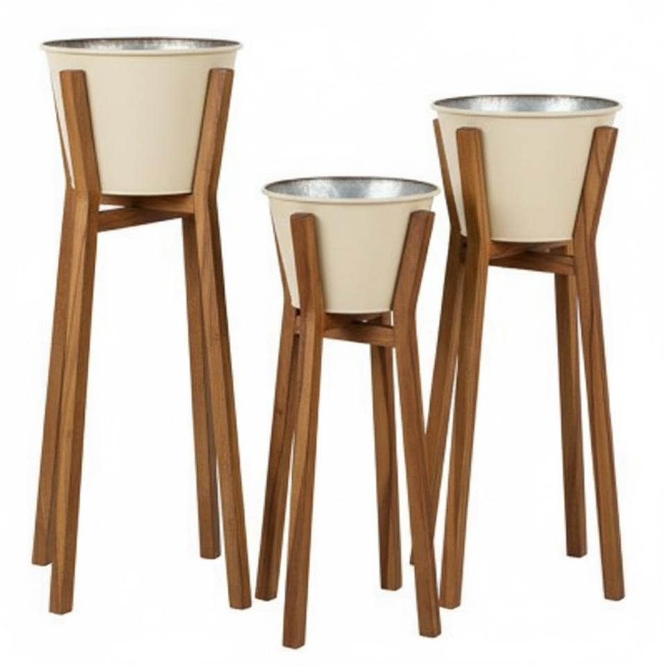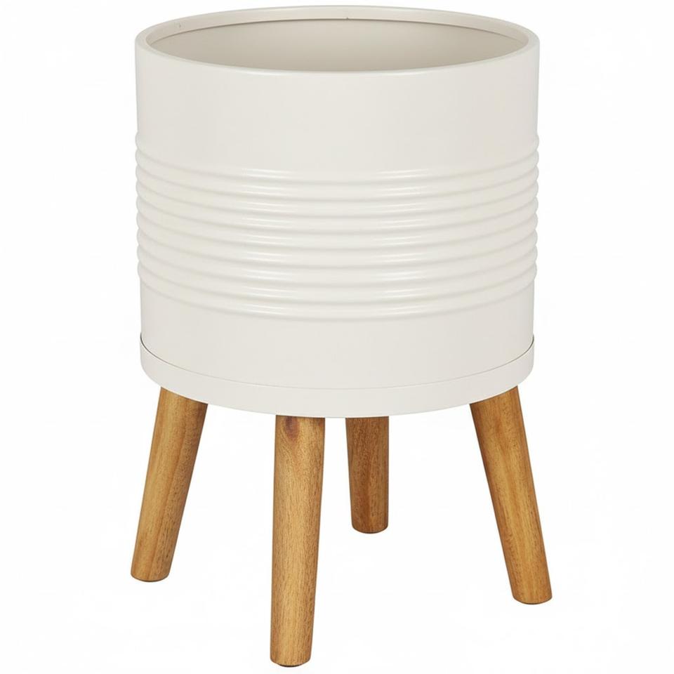 Prime Quality White Powder Coating Metal Planter With Wood Stand Indoor Outdoor Freestanding Flower Pot Holder Home Decor